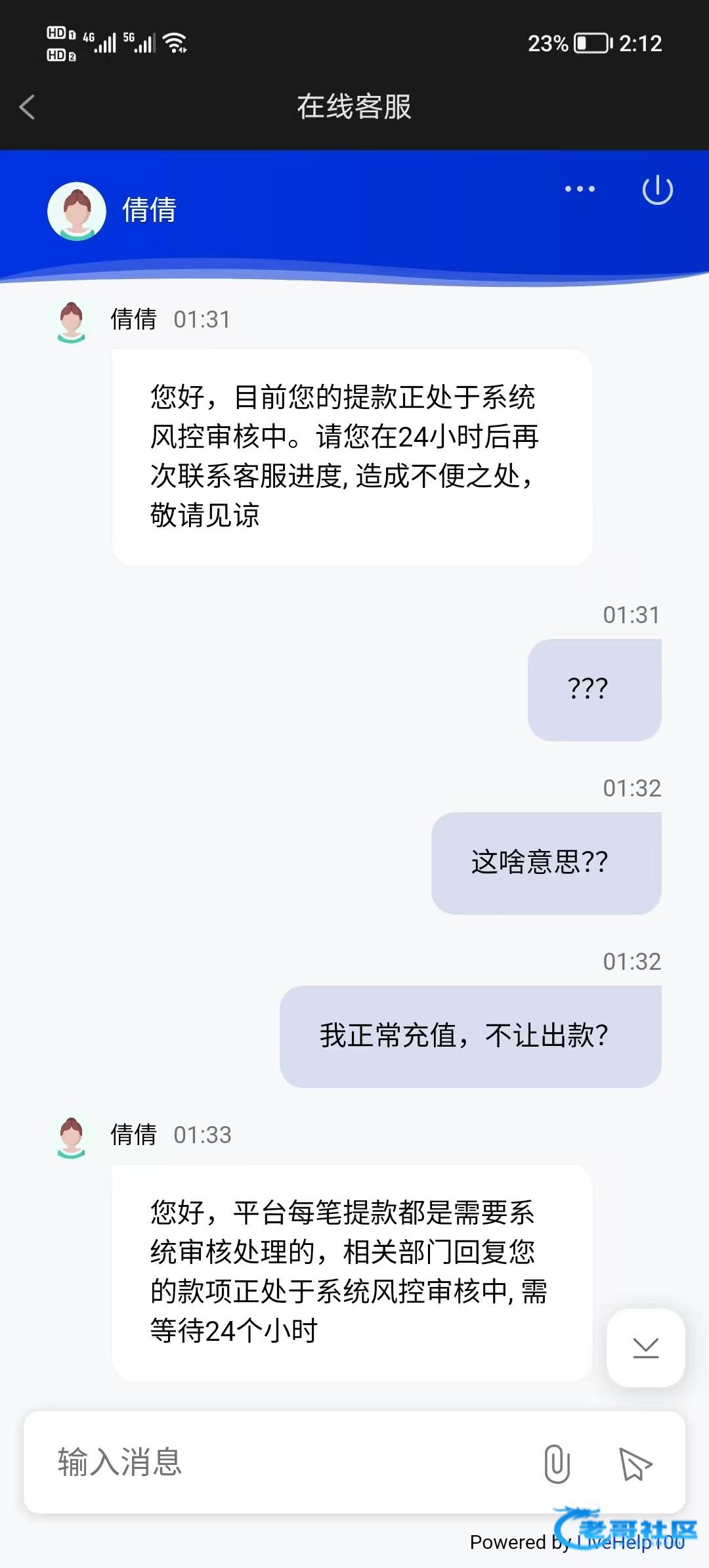 头一回见到这么恶心的台子,每天存50,连续存了10几天,唯一一次打出来以小博大,提了588,半天不到账,去找那个人妖客服,给我说风控24小时,为了客户资金安全着想,他只是客服,叫我别为难他,跟我装女人。今天过了12点,去找他,立马变成男人的语气,什么改ip,套利,各种话术专业词语,全给你来了,一看就是个老诈骗狗。