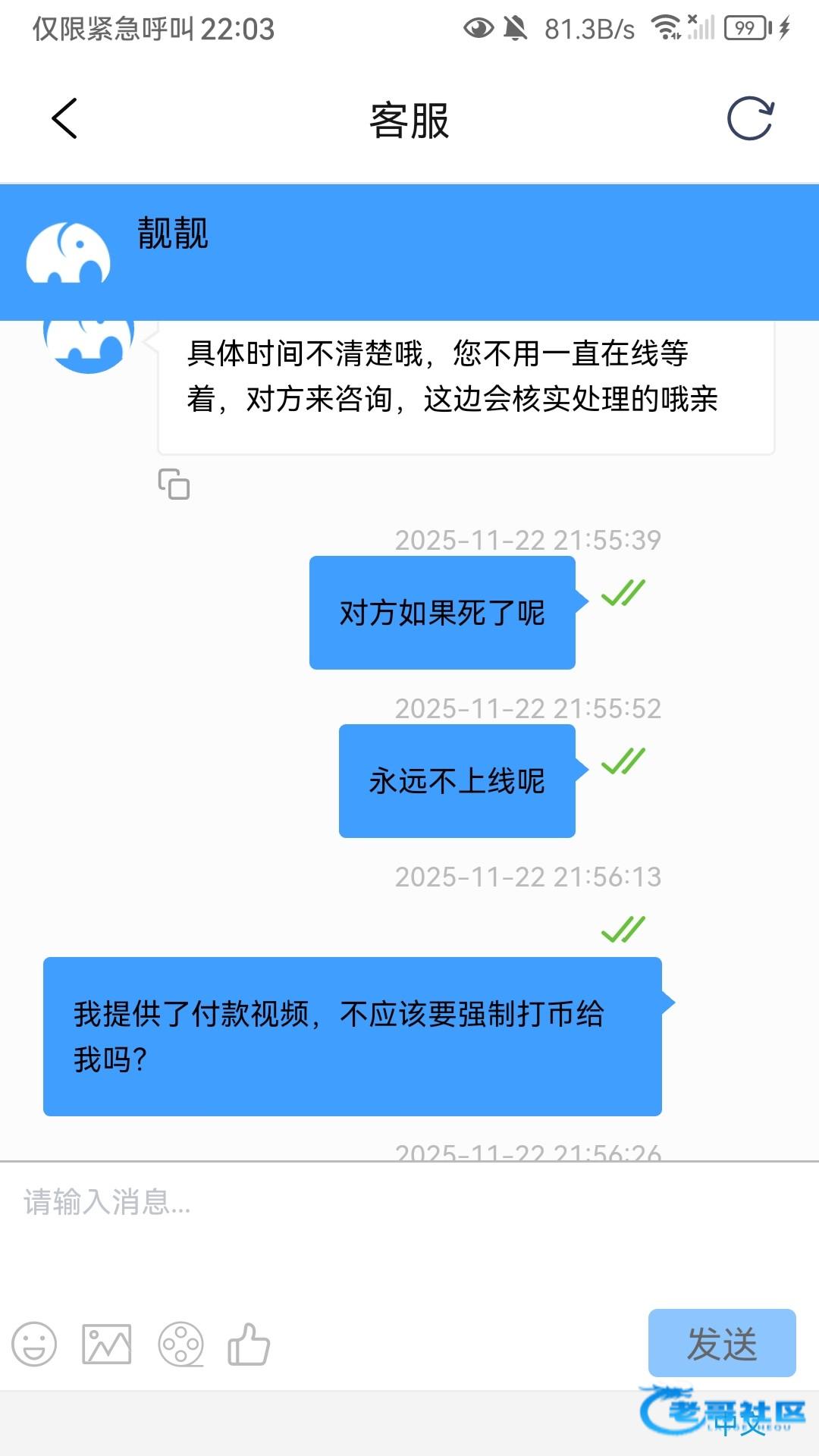 我遇到过一次p图,视频完没收到钱,立马退回了,12点以后你换客服,应该行