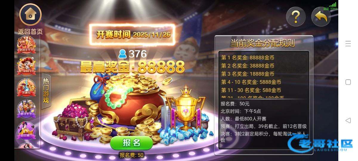 刚才看了一个别人的帖子,斗地主日噻第十名奖励28,我笑了这也能拿出来推广,我这两个平台日赛第一名300第二名168第三名100第四到第十名68,斗地主月赛报名费50比那个PG周赛门槛低多了,网址52662.com,还有一个 9526.com 截图为证