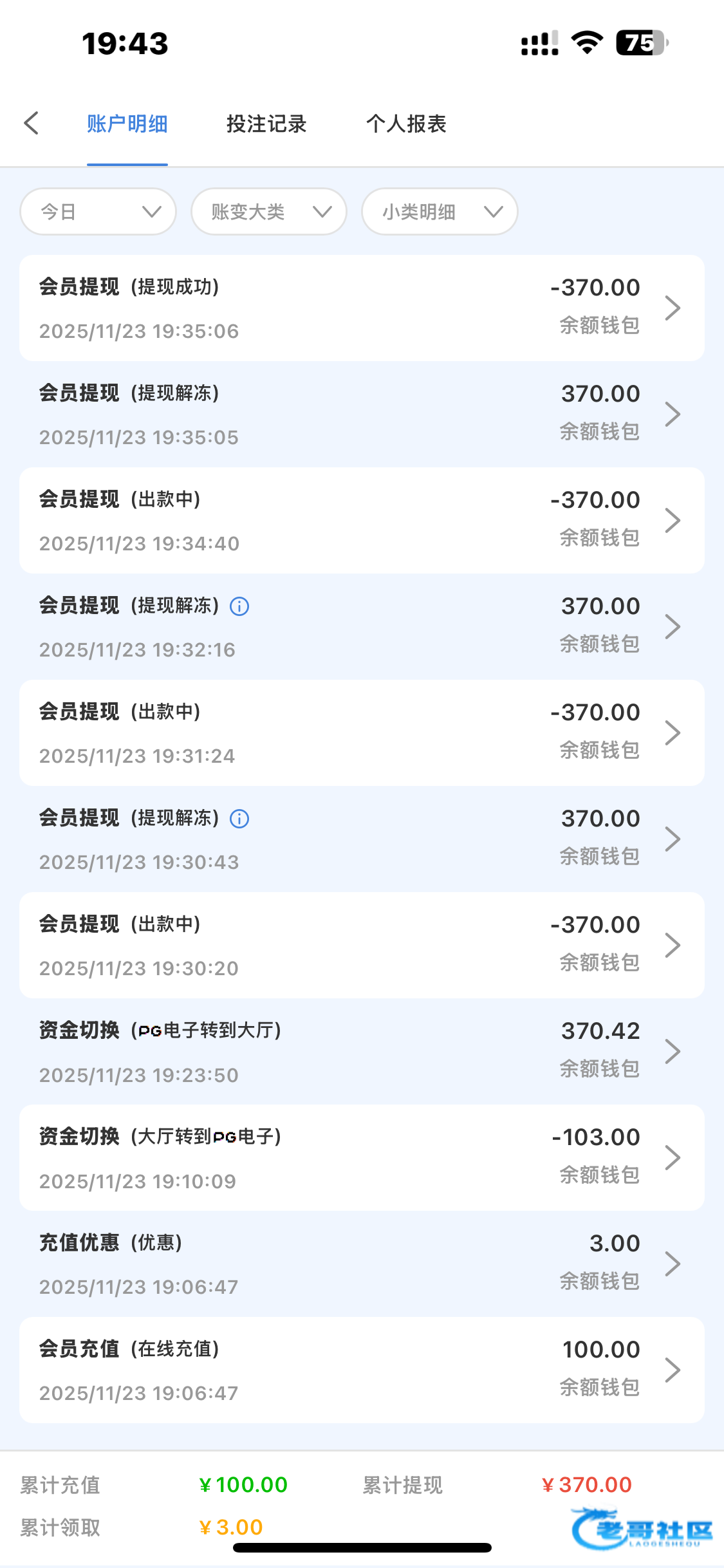这逼台子,充了100,领了首存18,App18,加聊天软件18,苹果马甲包20,AB钱包10多块彩金,其他什么打码彩金加起来100多了一次胡没进。不过包赔直接到AB钱包还是给力,白玩