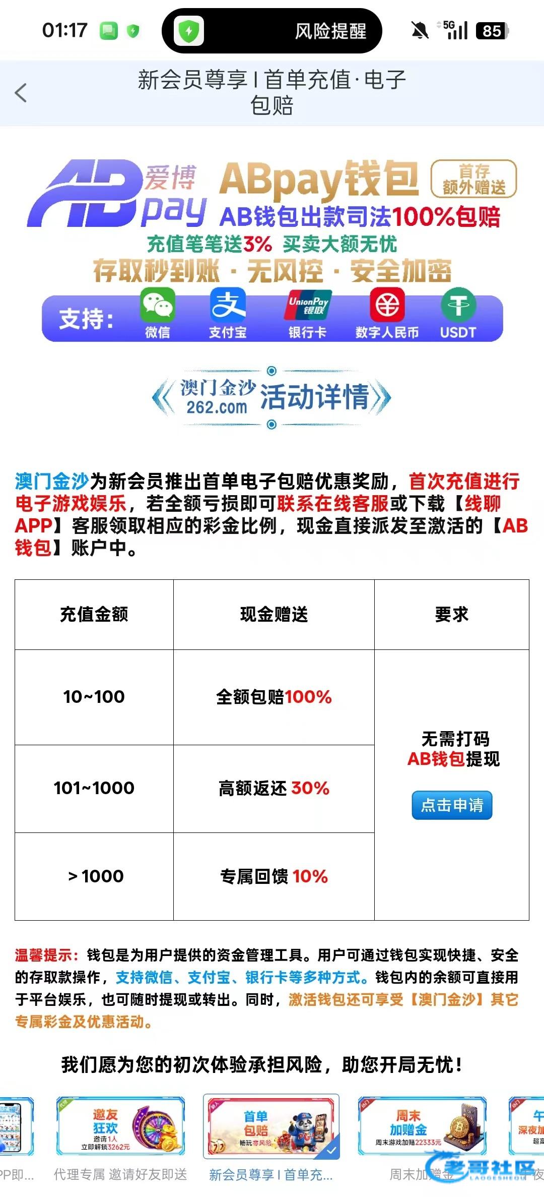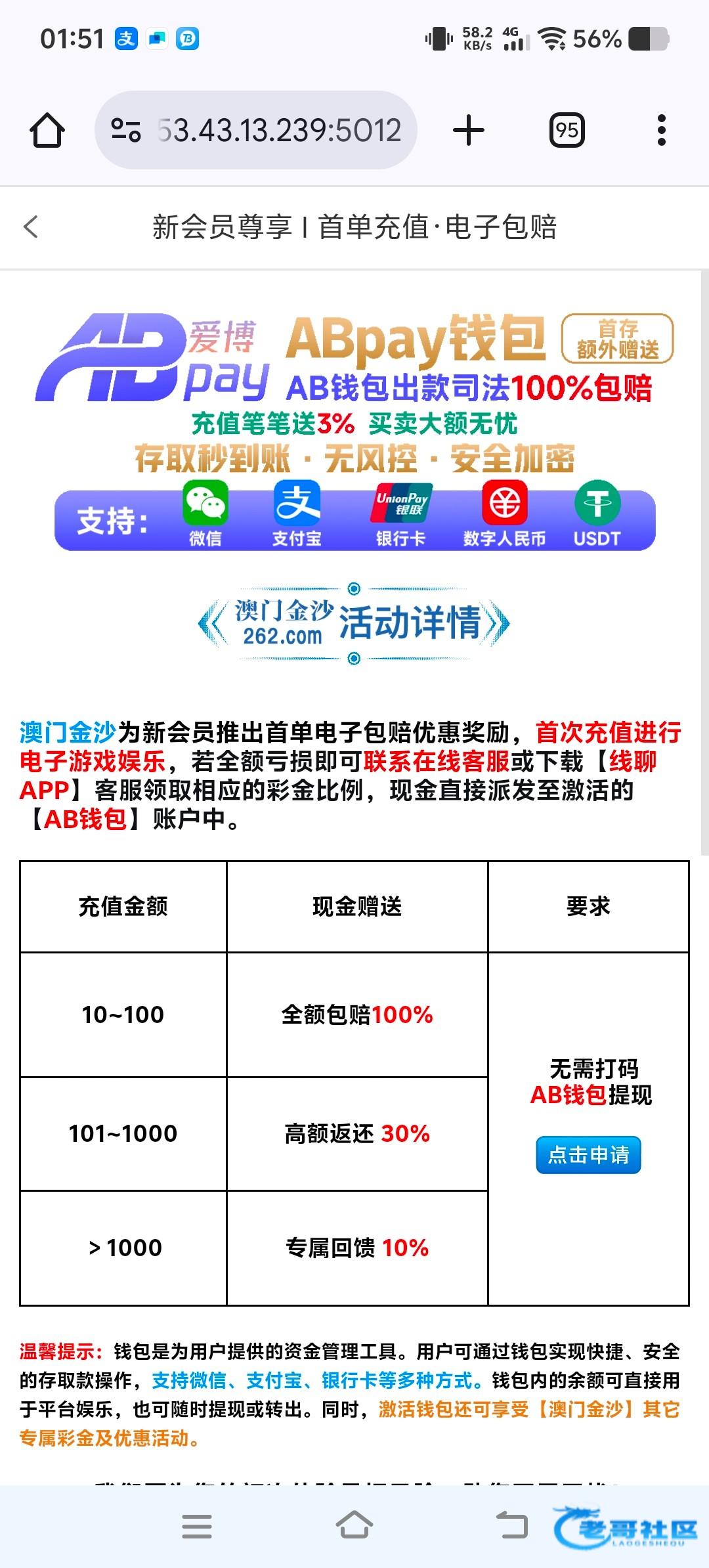 妈的,前天充了10块,今天看到你帖子,去用ab钱包充值了100,最后打输了去申请包赔不符合了,后面领了38ab钱包彩金+18专属客服彩金,出了500