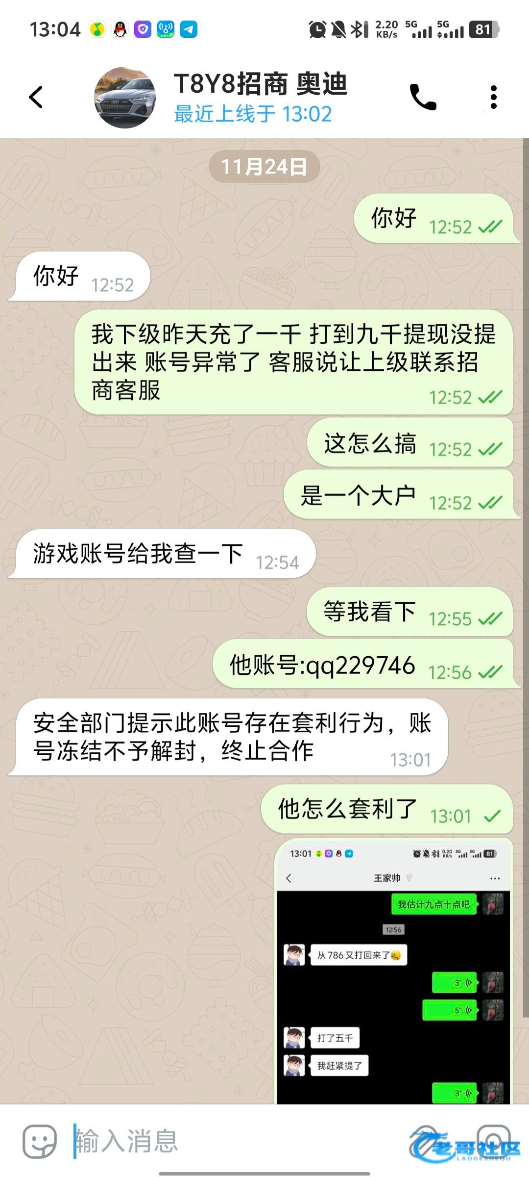 下级昨天充了一千 刚开始输了 领流水大到了九千多 最后被黑了 账号直接异常