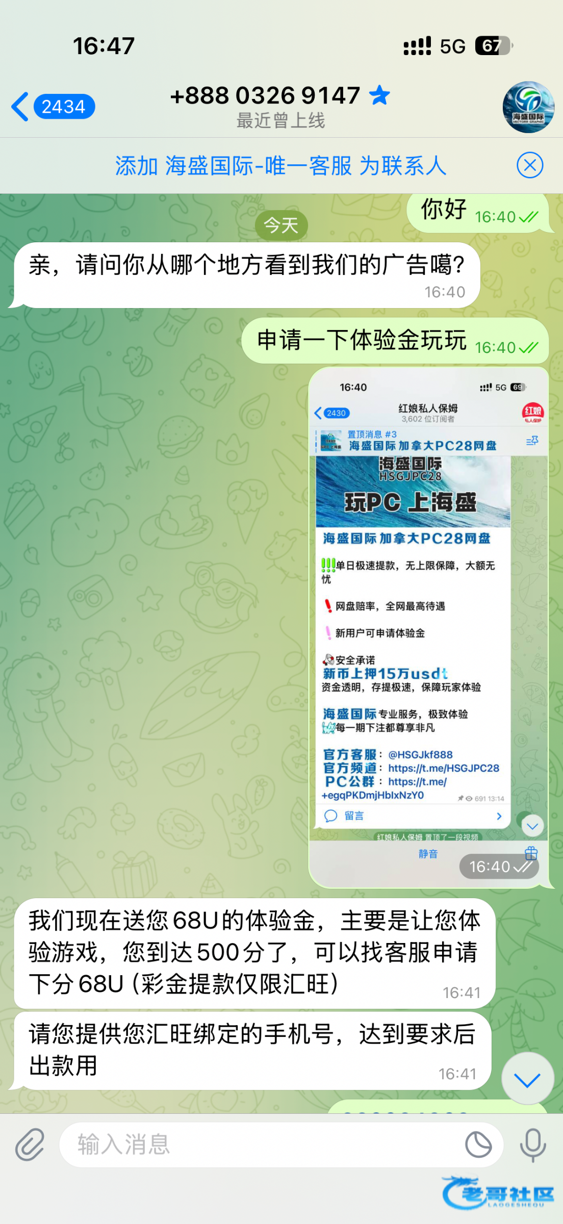 找客服申请体验金68u,打到500u下分68u需要提供汇旺手机号,问在哪看见的就在这个群https://t.me/xianvbaomu,客服✈️@HSGJkf888
