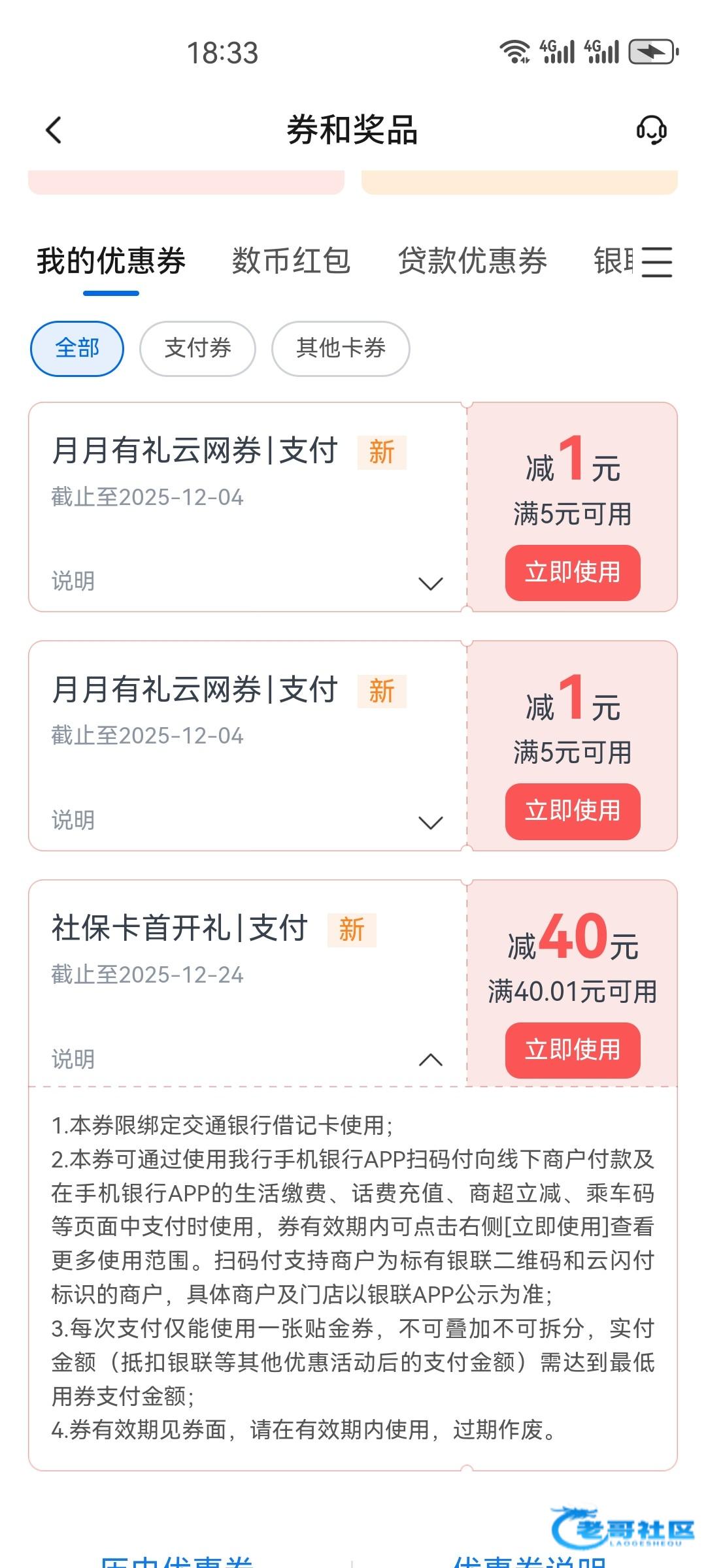 交通银行白嫖40贴金券,下载个交通银行APP,去开个电子二类户,然后去搜社保,开通成功会有个首开社保有礼,然后送40元贴金券,去下载得帮 http://spread.cqallw.com