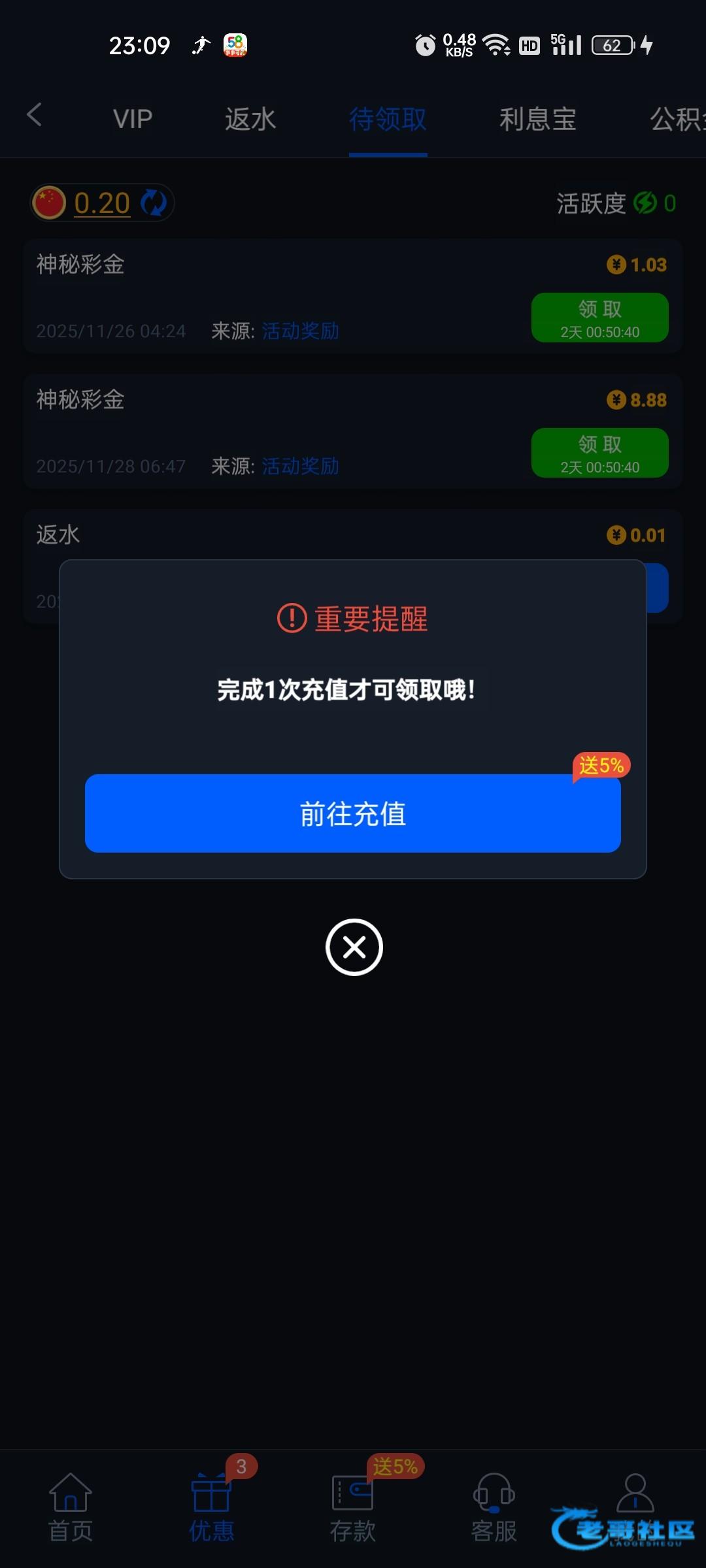 冲了20本来想领20➕8结果要第二天领取提现了100不知道能不能到账