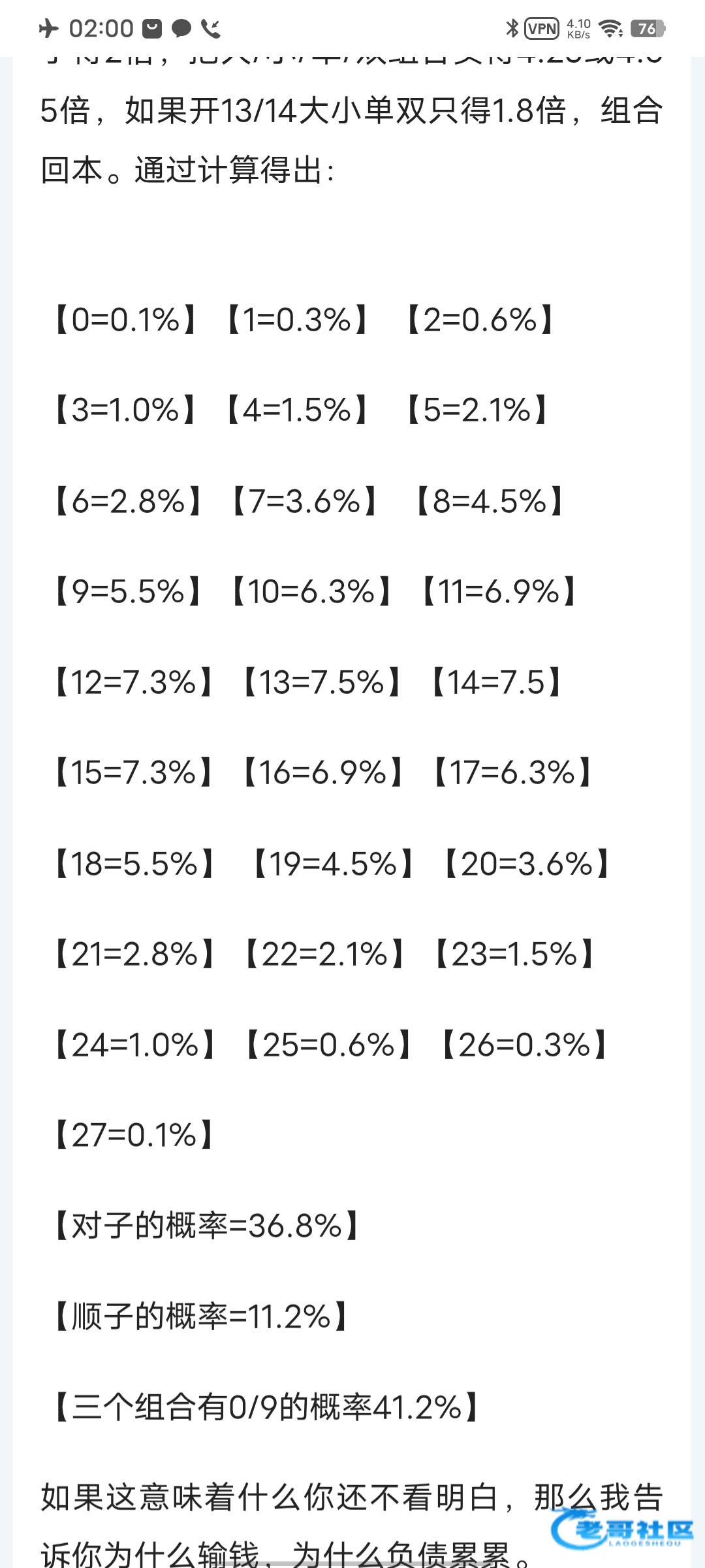 这个老哥算的很对的,赢得概率是百分之27,回本概率是百分之23,输得概率是百分之50,一千个组合,随便找个彩票杀码组合,杀对子,顺子,豹子,和值13-14,只有百分之27的概率了,老哥没说错,长期玩只适合玩1.88,2.8不行