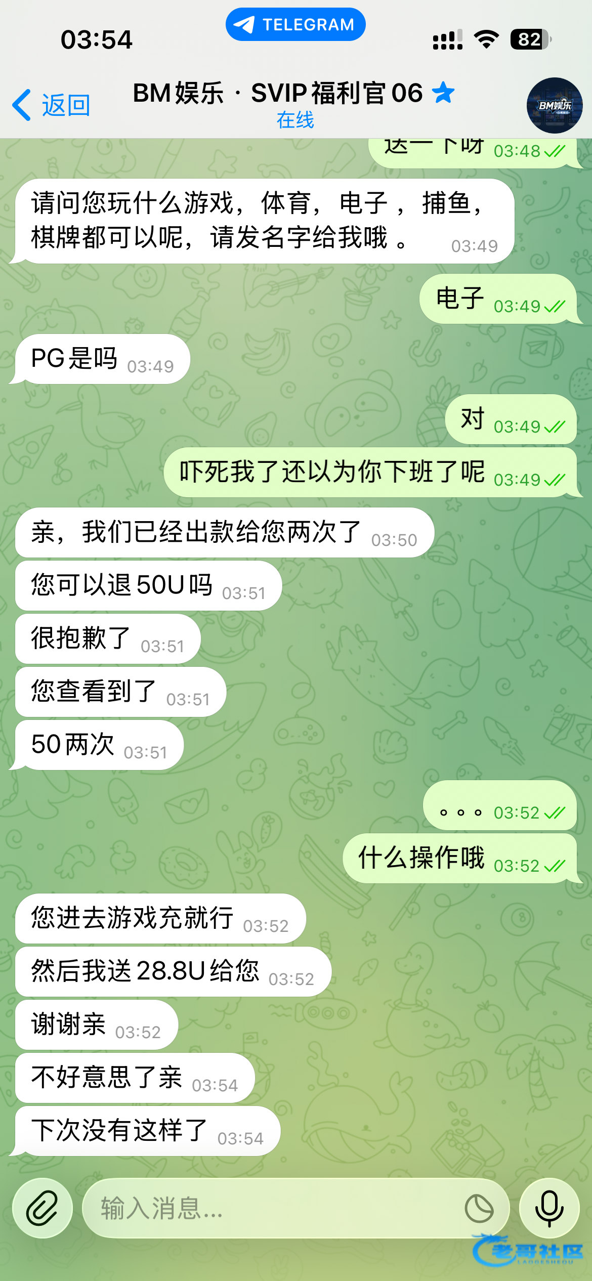 笑死我了28.8u没有申请到,狗庄让我充30u再送28.8u然后我充了打到50u直接提,没想到还有意外惊喜给我打了两笔50u,我去找他要28.8u的时候直接让我退回去再送,这个客服是不是要被电了。真的笑死我了