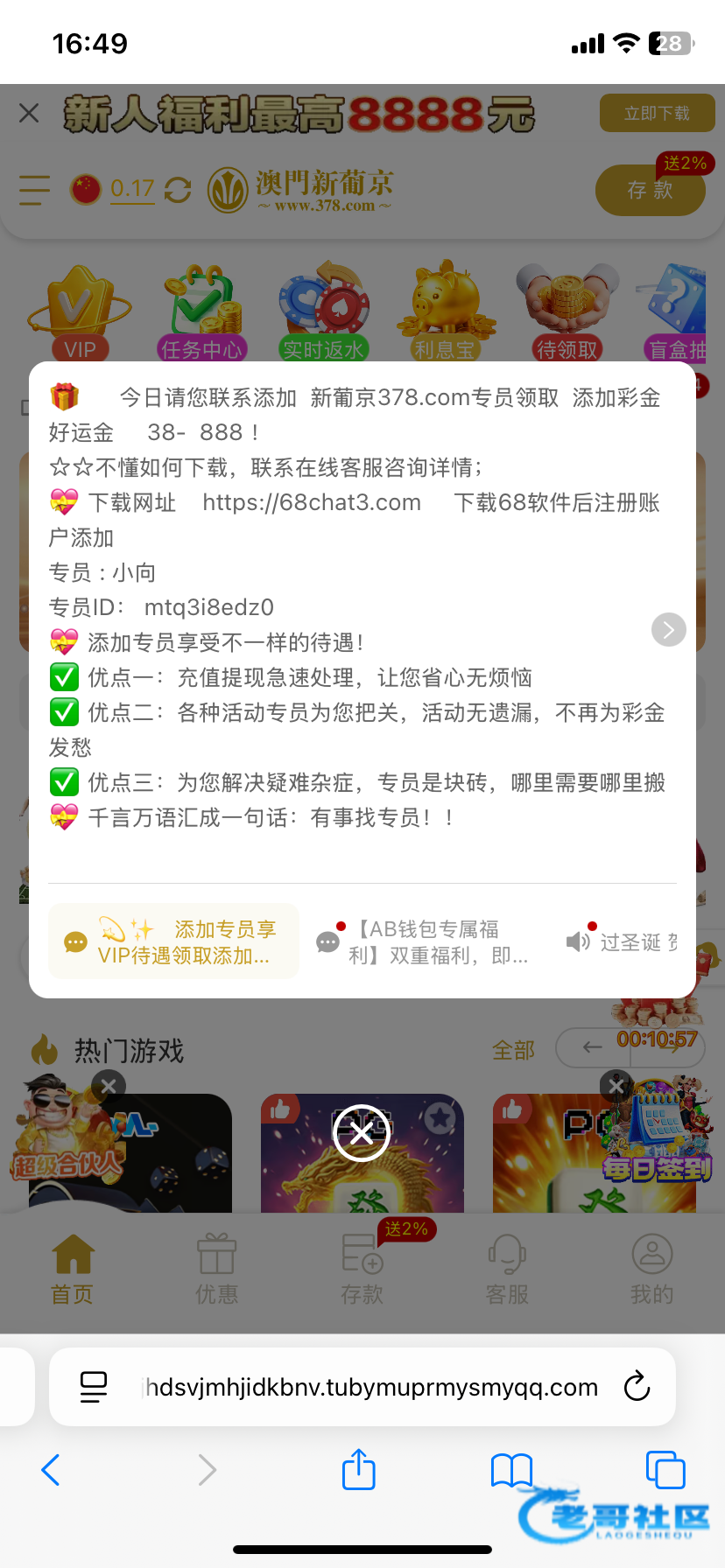 @老哥网上岸哥 ,你可以添加68专员小向,你就说昨天我充值了4000,申请一个好运金,他会给你申请的,只要每天充值100以上,第二天都可以找他申请,就是因为这样,所以我在这个台玩了两个月,一共输10W多,每次充值第二天都去申请