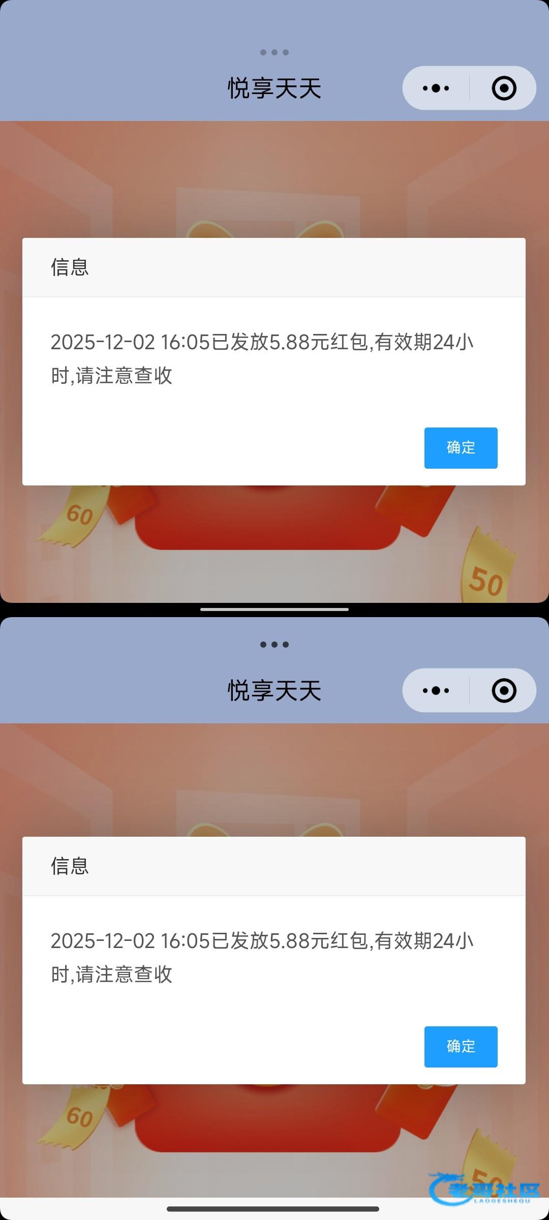 我看好多老哥不会领,就是到小程序那里的时候不要领取,点右上角转发给自己小号然后小号打开了就跟大号同时点领取,一台设备可以领两包多设备多微信多领,这里说一下安卓设备要分屏,小窗口不能两个同时点因为小窗口有主次之分