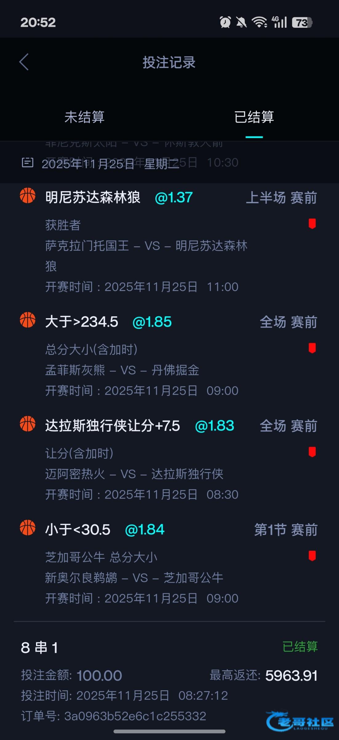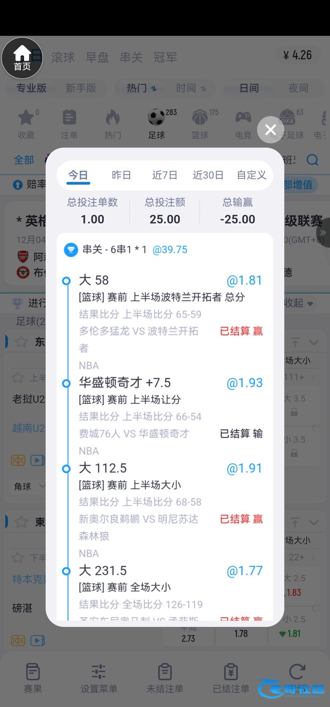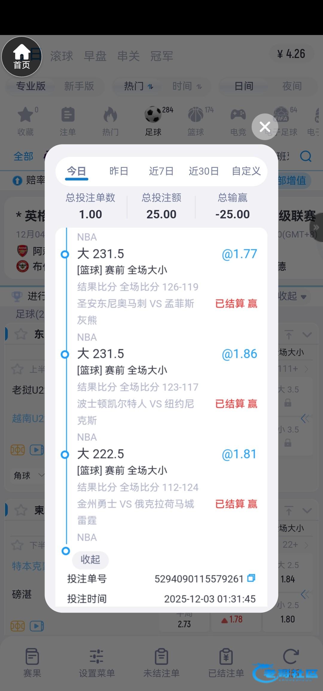25块钱,纠结啥,我8串1都中过,那天20块钱赢了5万,也10串1下500,中了就是30多万就差0.5球,还nba下的4串1下了5000一场没对,总体来说体育是赚过钱的,但是从玩了百家乐棋牌电子就再也回不去啦