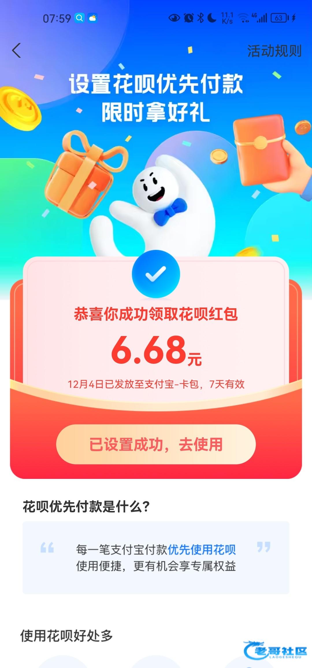 领完最后点我的,右上角设置,支付设置,支付顺序,最后把花呗调到自己想要的支付顺序就可以了