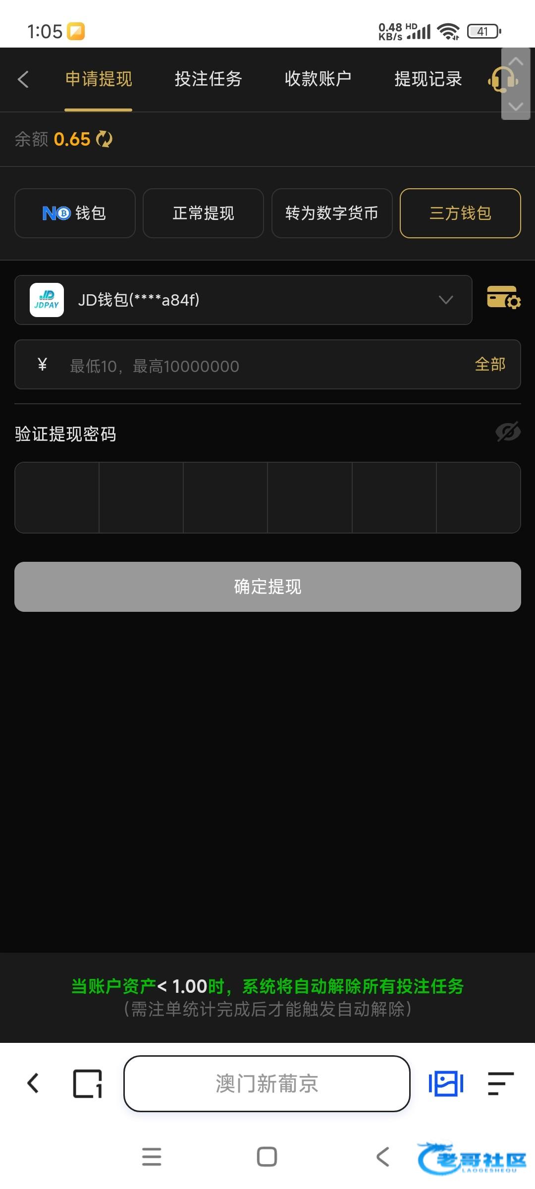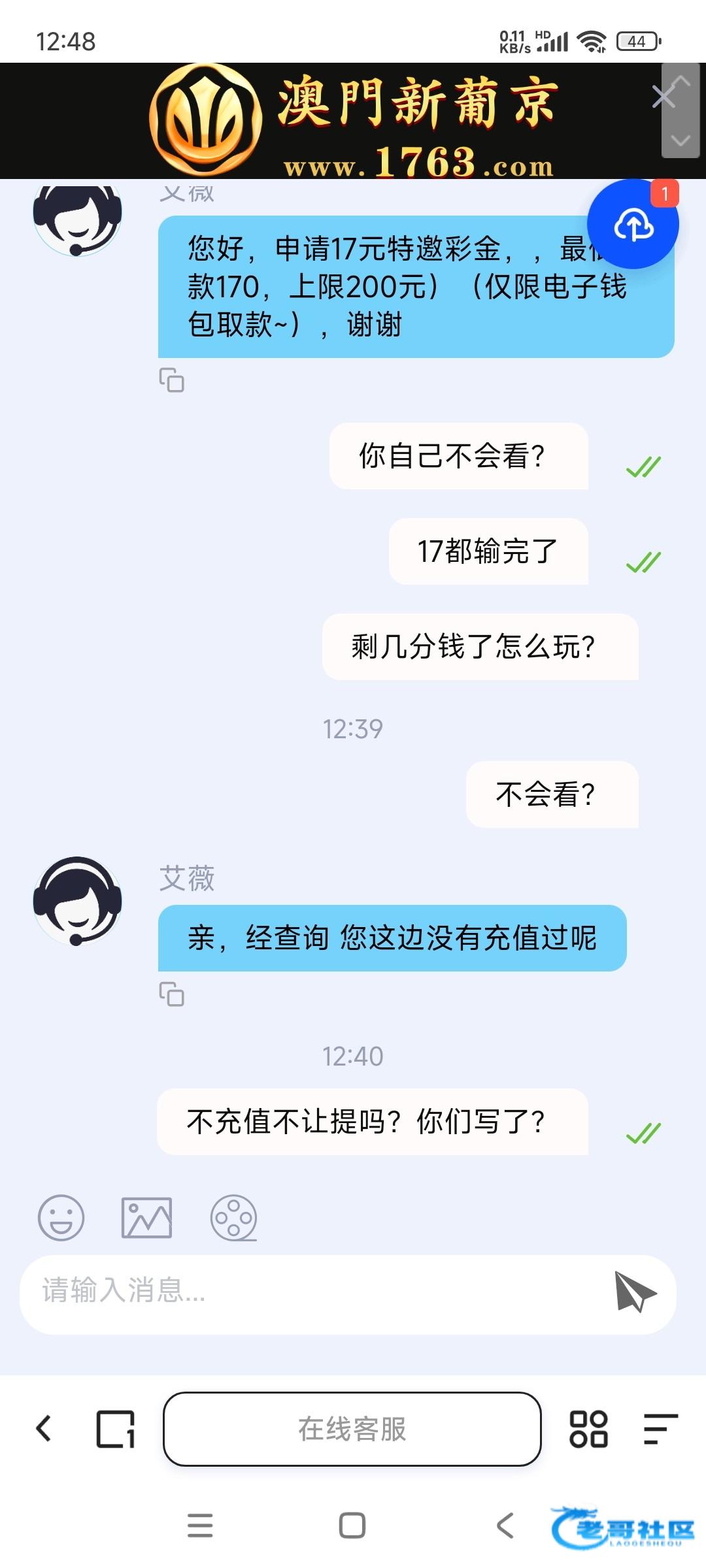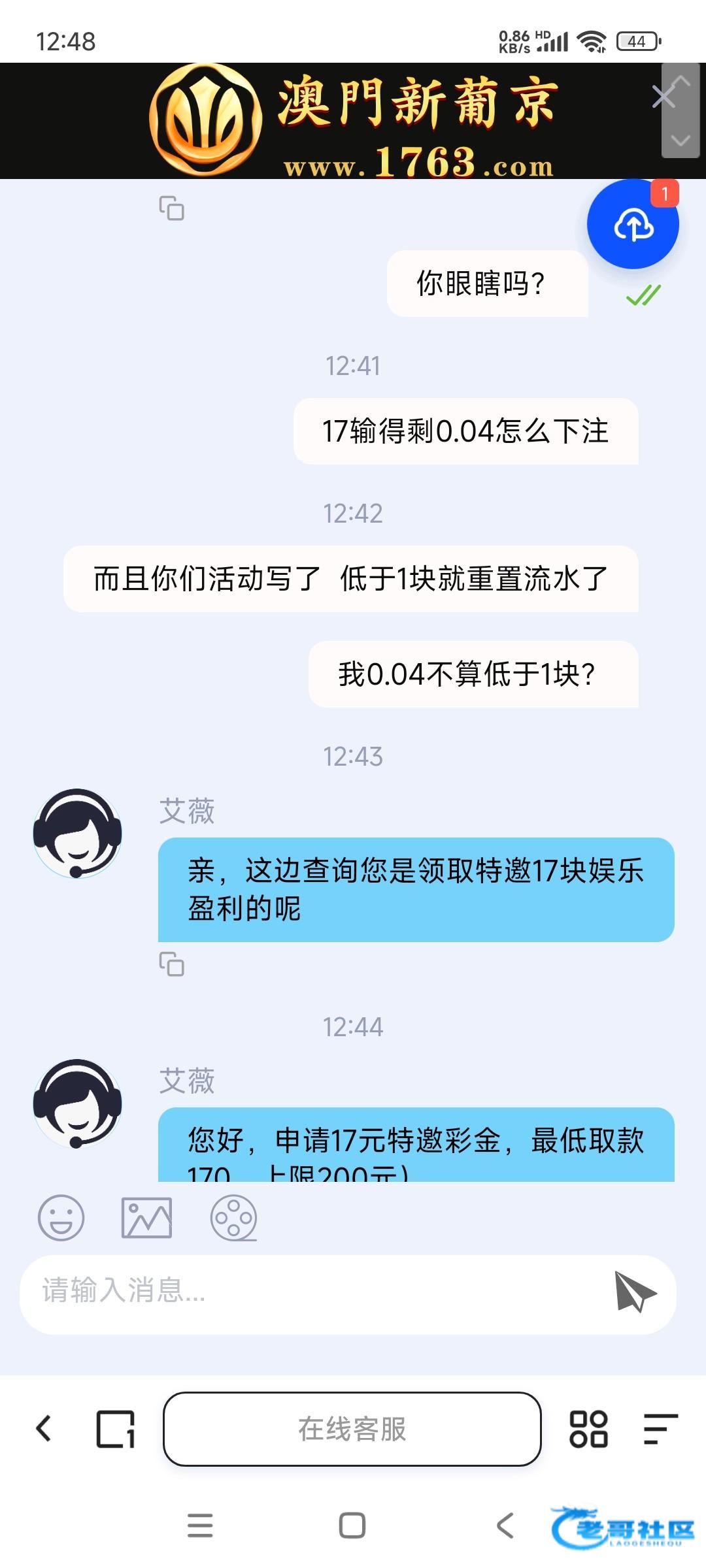 1号特邀17输完了剩0.04 退出来领了1块钱返水 然后懒得玩 今天上号用1块钱打到100提款不给出 活动写着低于1块就重置流水 现在就是要充值才给提款 垃圾黑网