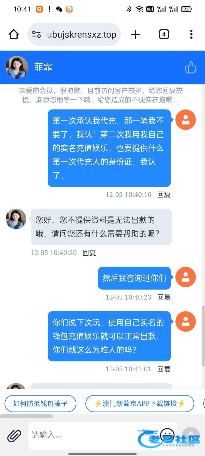 我第一次玩的时候,在微信上找了代充,充了100块嘛,然后领取了几天包赔奖励,然后打出来300块,要代充人和我的身份证才给出款,代充人的身份证肯定提供不了的,然后我选择不要这笔款了,然后今天早上,我使用我自己的钱能钱包充值娱乐,提500块,还要我提供第一次人的身份证信息,(因为之前我问过另一个客服说,下次玩使用自己实名钱包就可以出款)!!真是黑的套路太深了