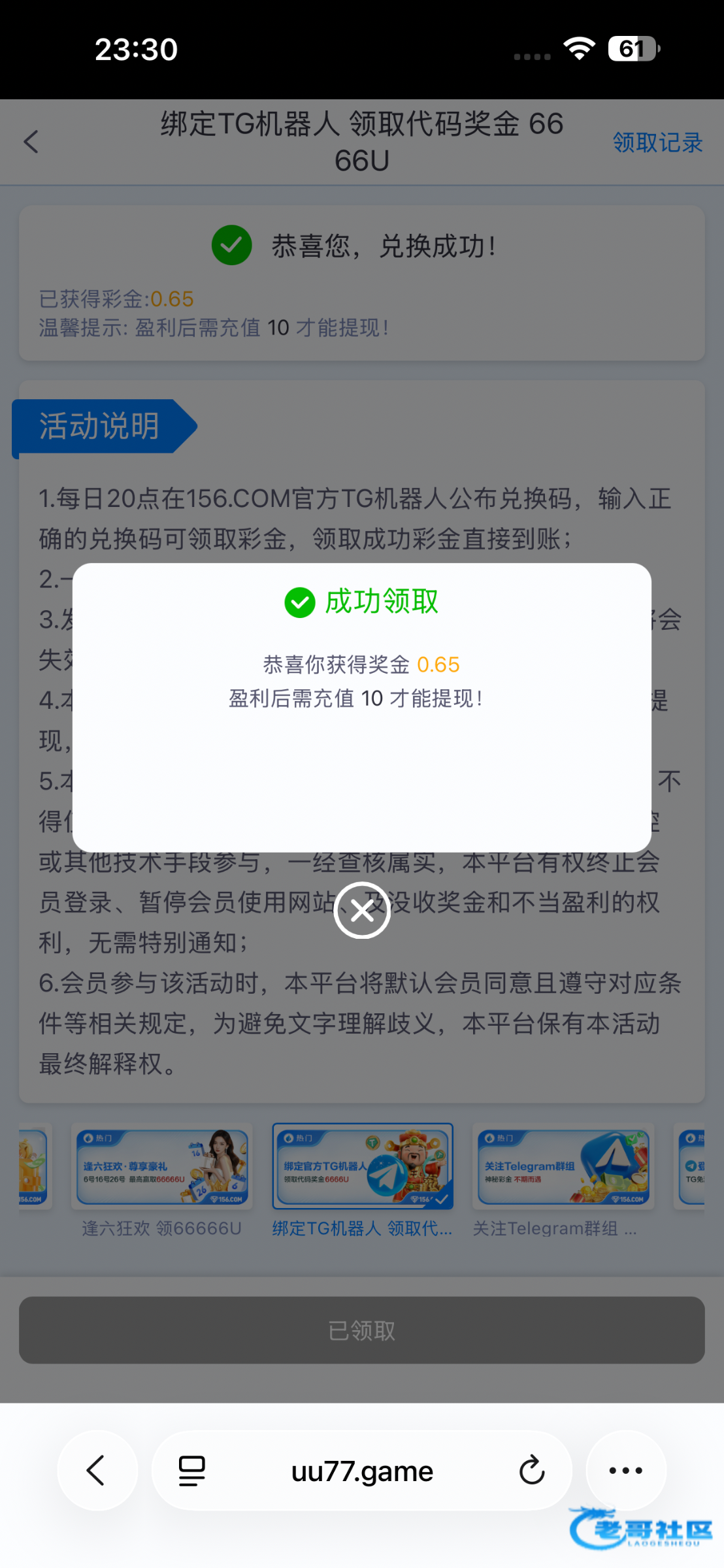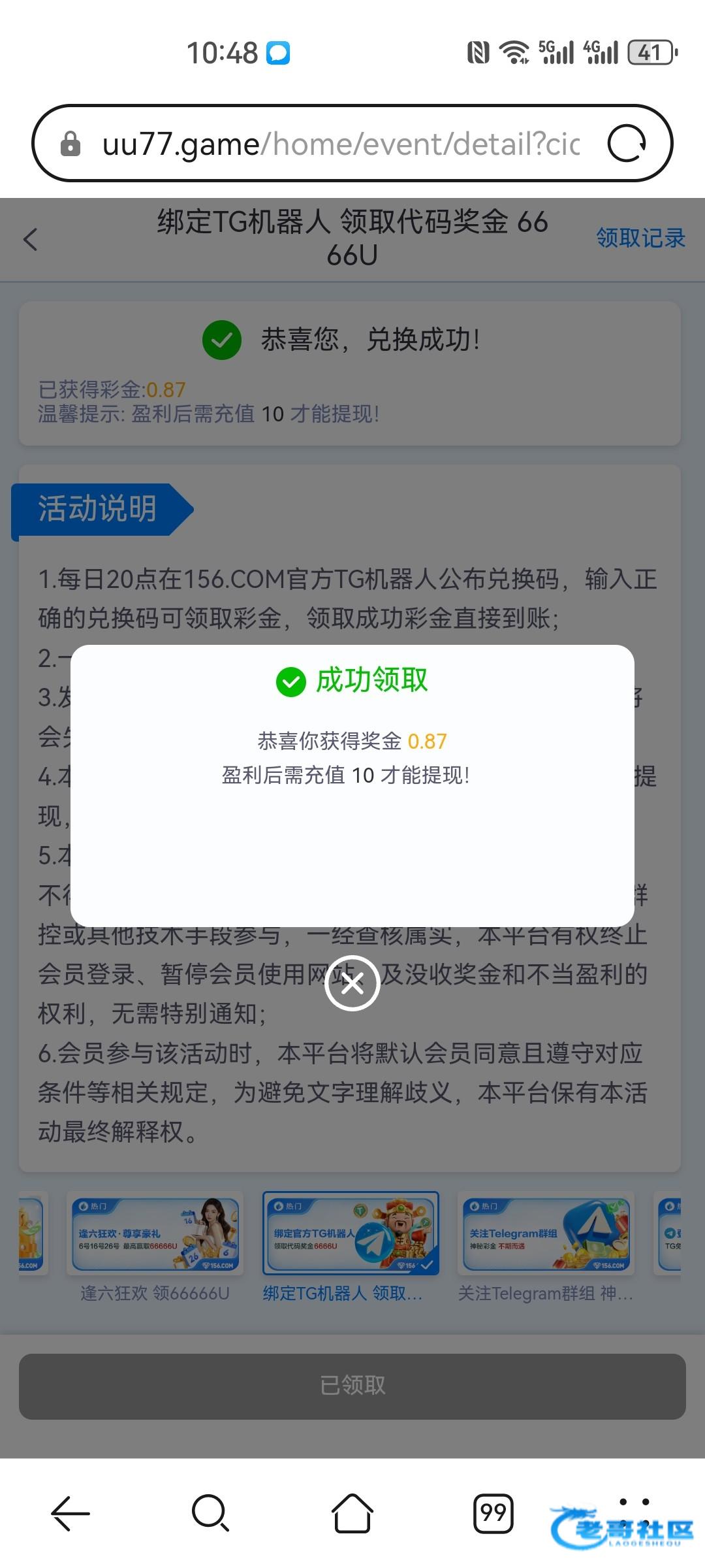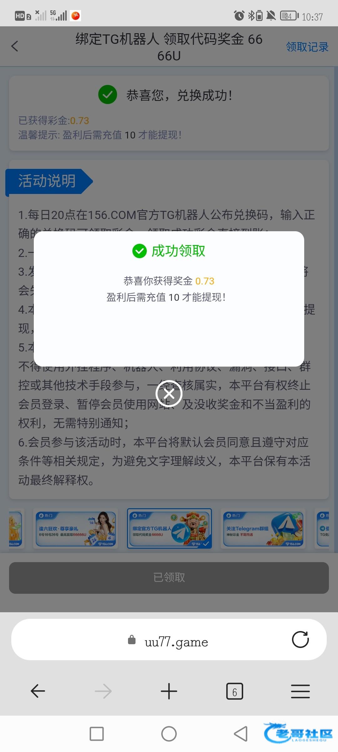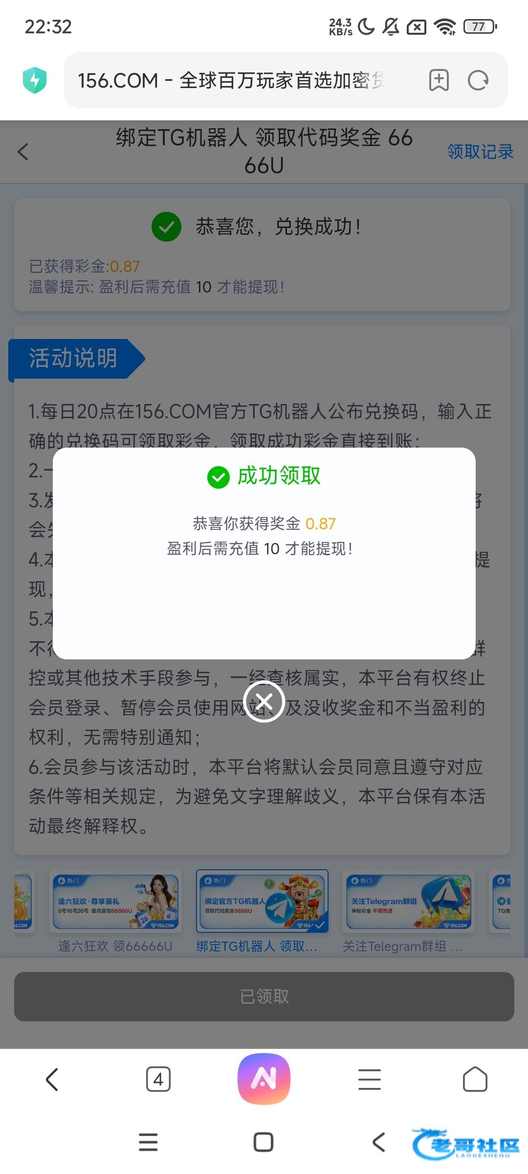 中奖的已经全部派发,在论坛点击个人-消息查看彩金码即可,复制彩金码到平台-活动-综合-绑定官方TG机器人里面输入彩金码兑换,金额是随机的各凭运气