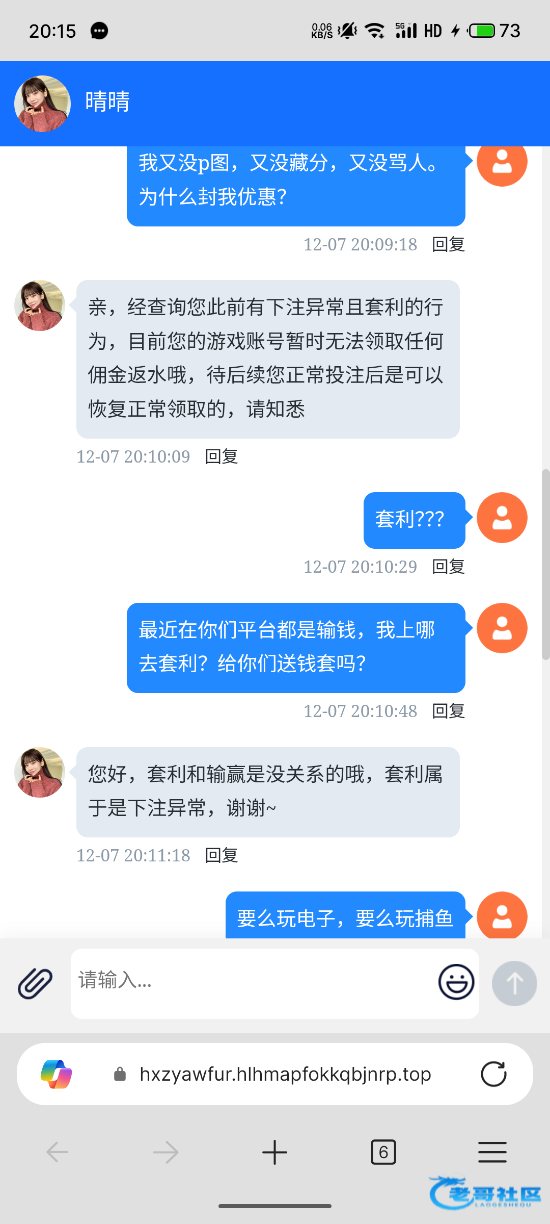 好煞笔的台子,屁事没干就封我优惠,我一个只玩电子捕鱼的人,说我套利,昨天还正常充值,最近一个月都还是输的情况下都封优惠,恶心死了