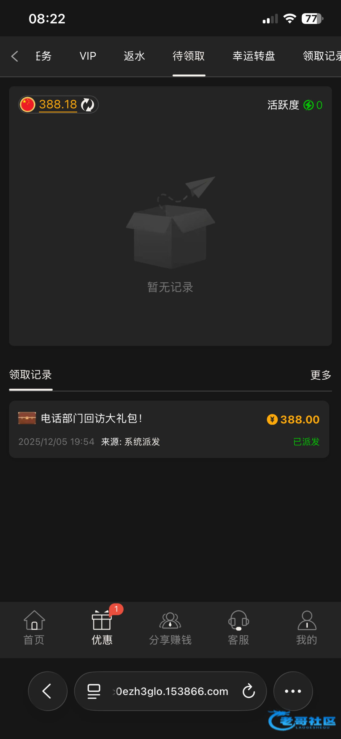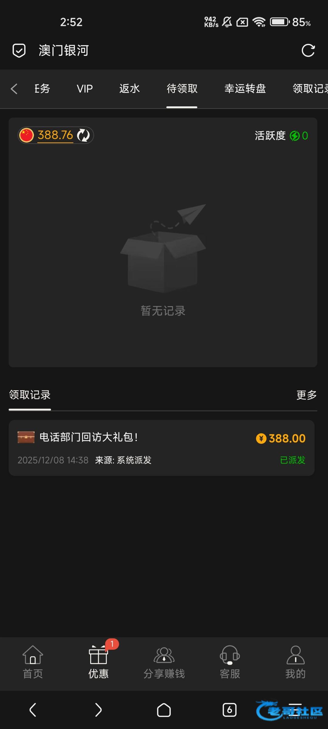 7月份送过我388,但不是电话彩金,现在去问一毛都不给了