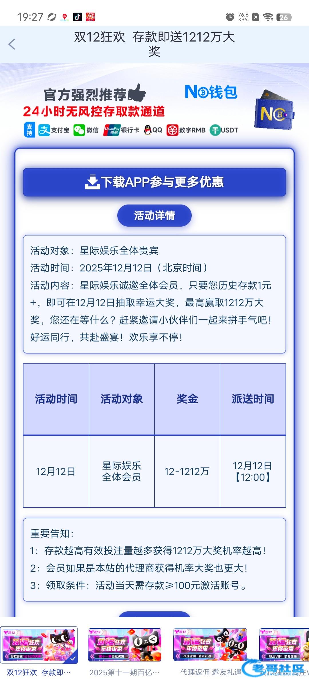 很多老哥都玩过这个台 历史存款1元+,即可在12月12日抽取幸运大奖符合活动条件的会员在2025/12/12【12:00】>登入会员账号 >【优惠】>一键领取。 053.com