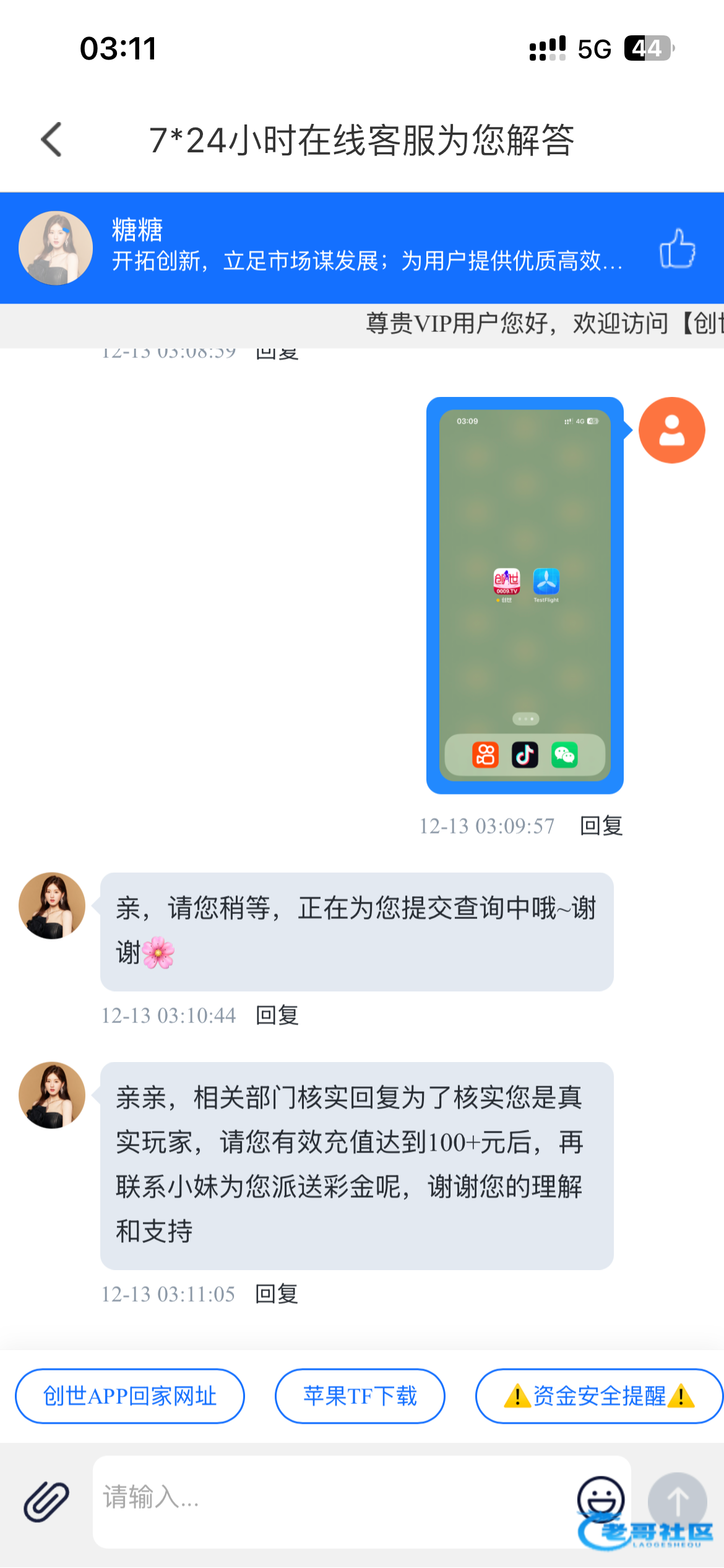 亲亲,相关部门核实回复为了核实您是真实玩家,请您有效充值达到100+元后,再联系小妹为您派送彩金呢,谢谢您的理解和支持