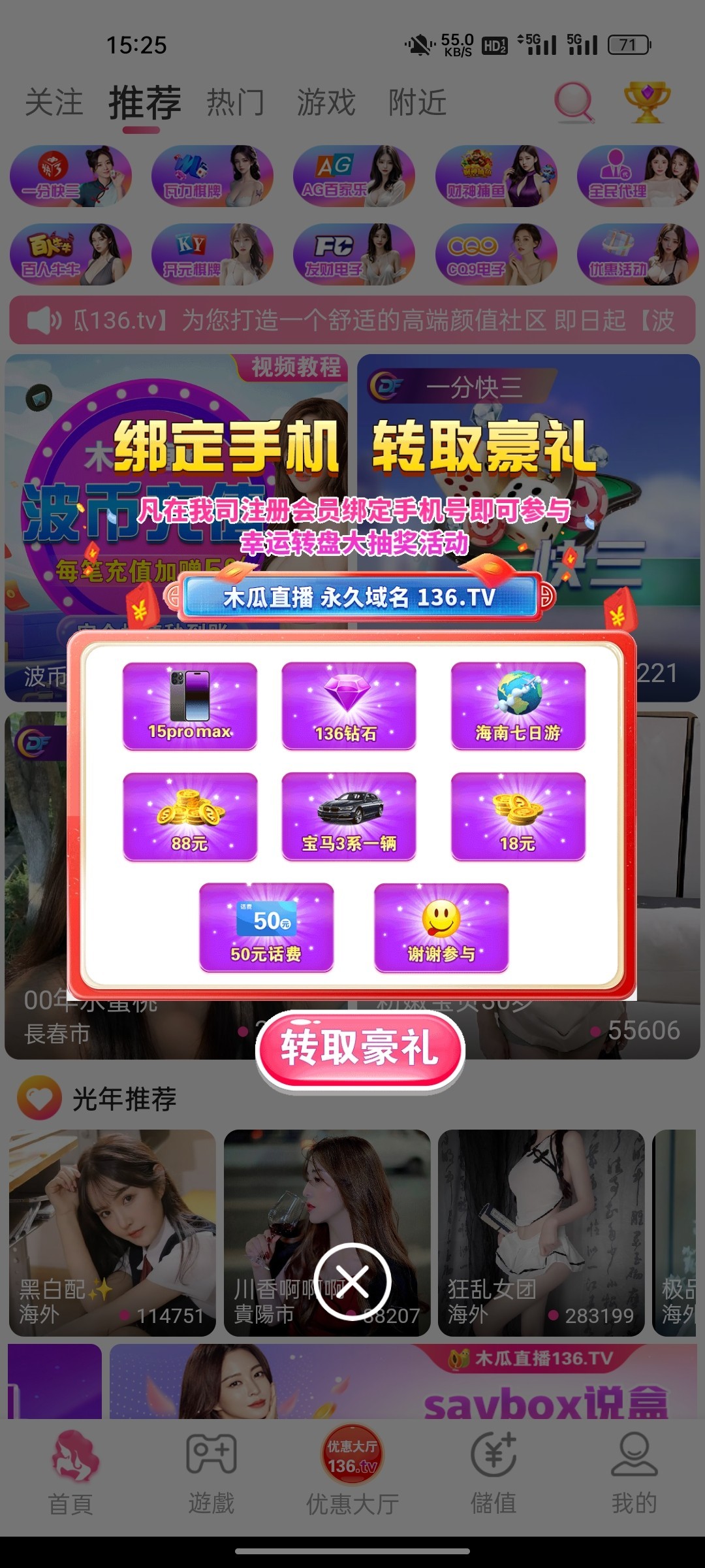 136.tv 木瓜直播抽奖送彩金,还有其他的奖励!我刚才抽中50话费然后给我弄成余额充值了我没打出来。白嫖就行别充值,打出来记得赏一个猪脚饭,哈哈哈!首页那里跳转到浏览器,填写你的id和手机号就可以抽了,我用谷歌浏览器抽的,有点卡别介意!