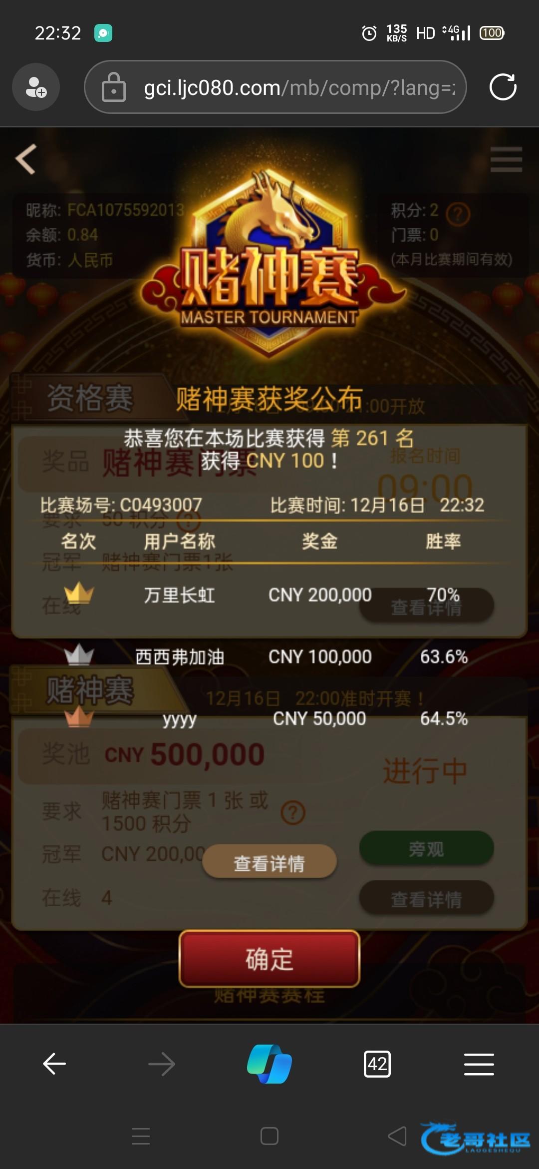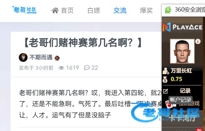老哥们赌神赛第几名啊?哎,我进入第四轮,就200多名,应该再稳一点才行,4局第一局就下了100k闲,结果闲4庄5就淘汰了,还是不能急啊。气死了。最后吐槽一下决赛桌那个西西,猪一样,领先95k,跟着第二名下就稳赢,结果被翻盘20w拱手相让,人才。运气有了但是没脑子