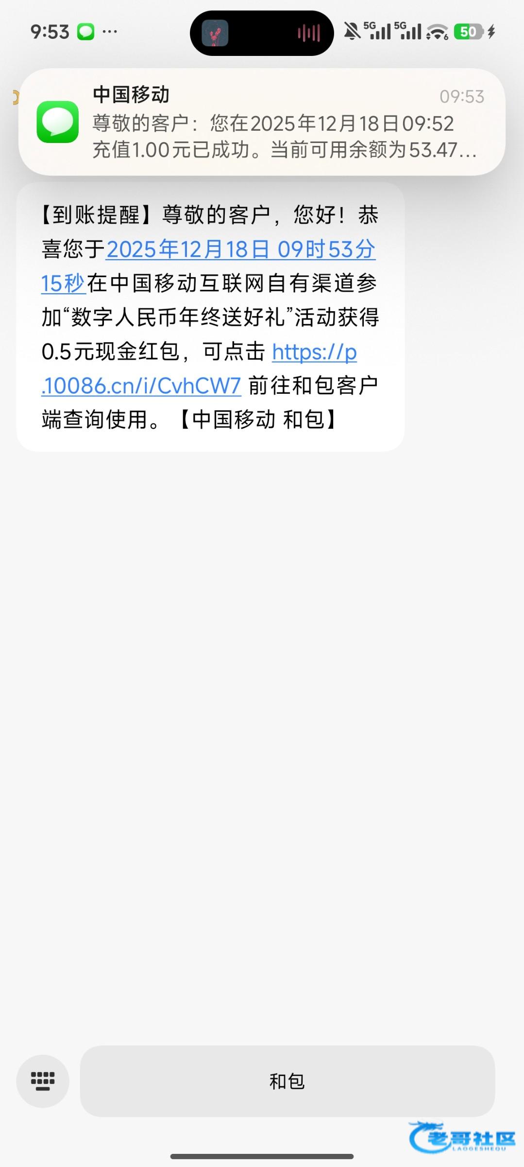 移动app充值话费1元,充值的时候选择数币支付,支付完稍等一会短信就来了,现在必得10块,下载和包登录提现即可,充值自己的手机号,就算到时候红包没了也不会亏