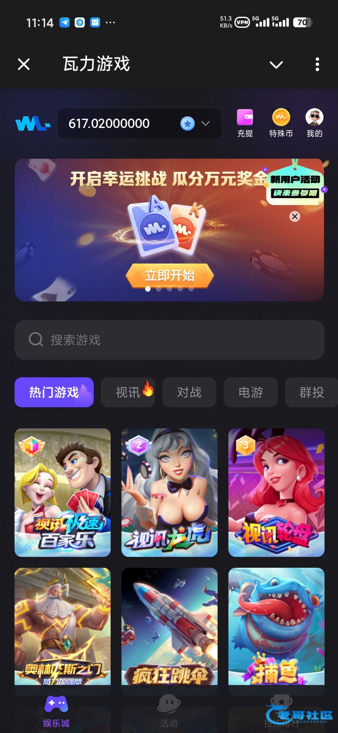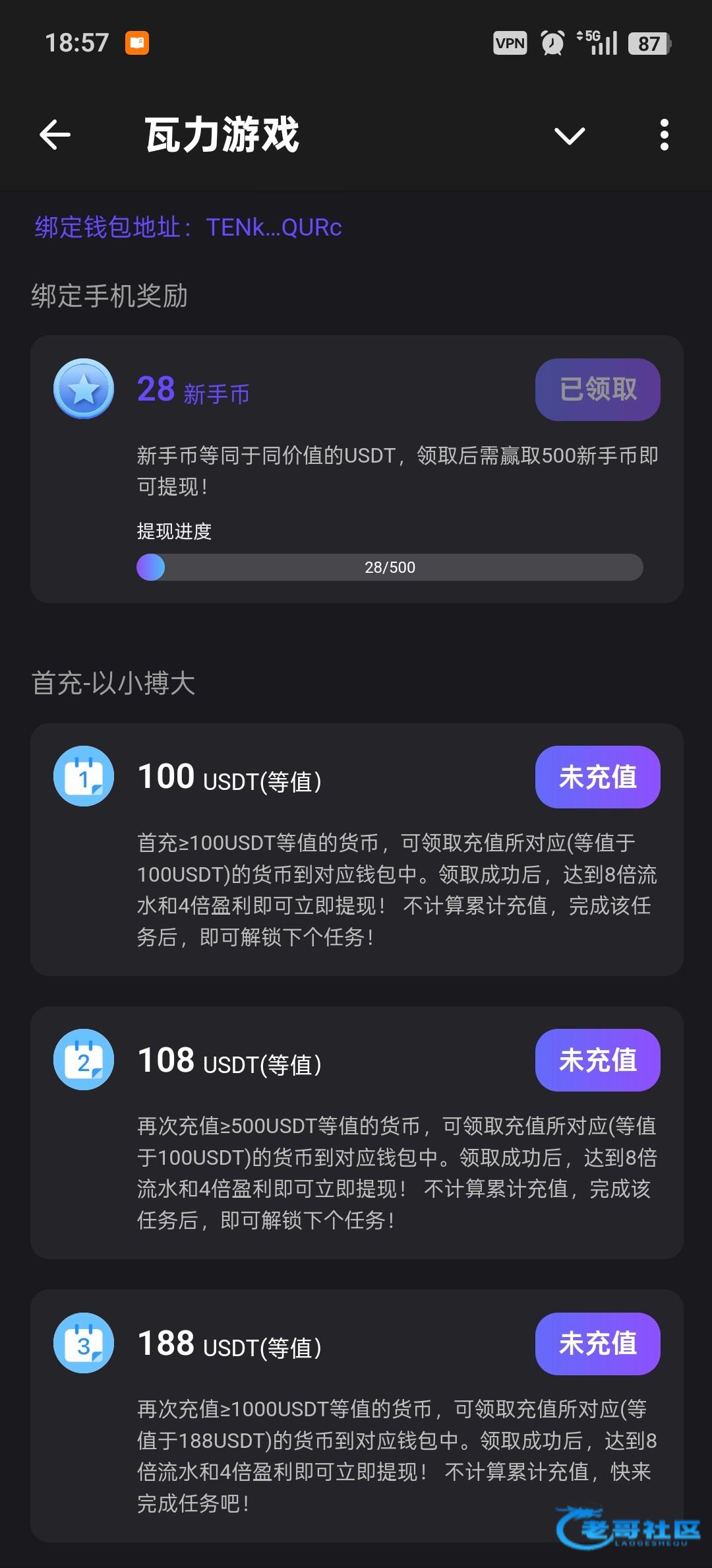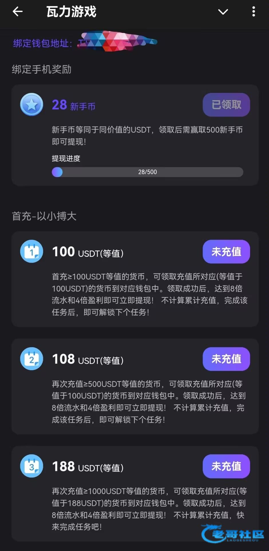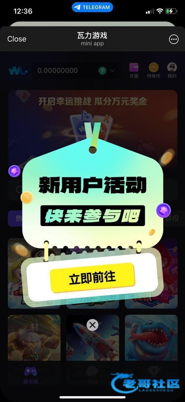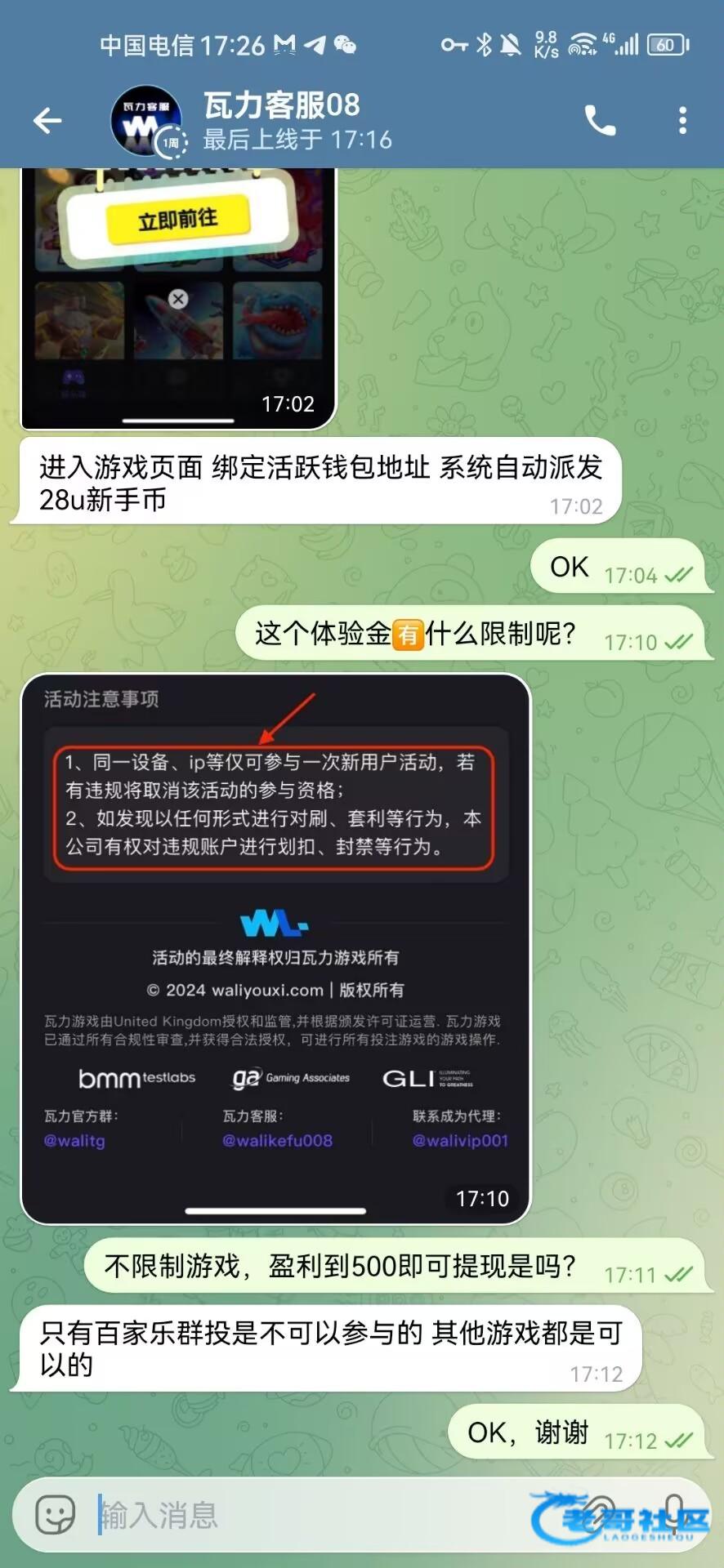 直接机器人进去,点新用户活动,绑定最近三个月活跃的地址和手机号自动领取,不限制游戏和流水,满500U提现(除了百家乐)