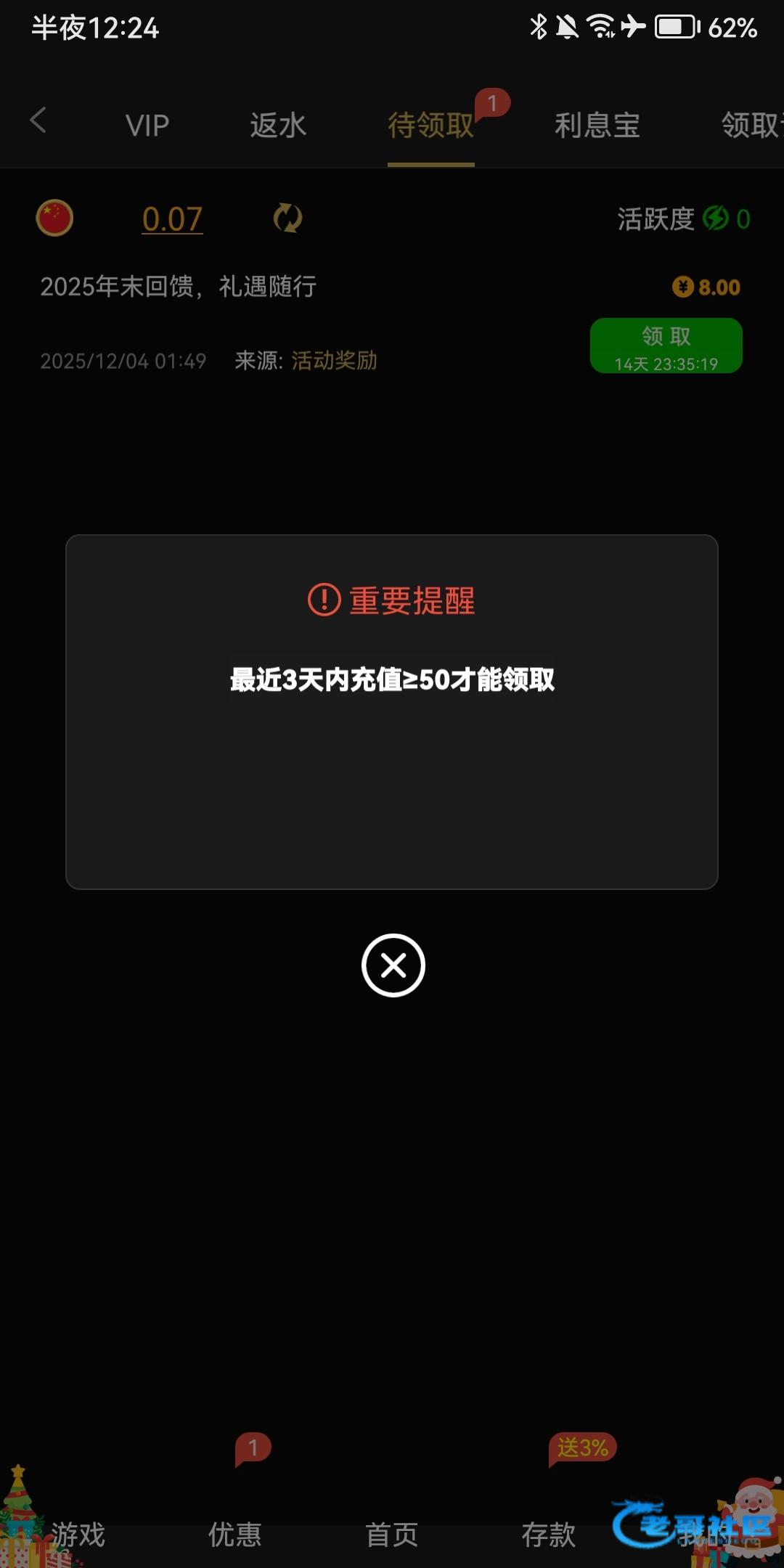 双12充值领过彩金的应该都有,可以上去看一下,我本来还以为只有一天,连续领了4天了。10起提,