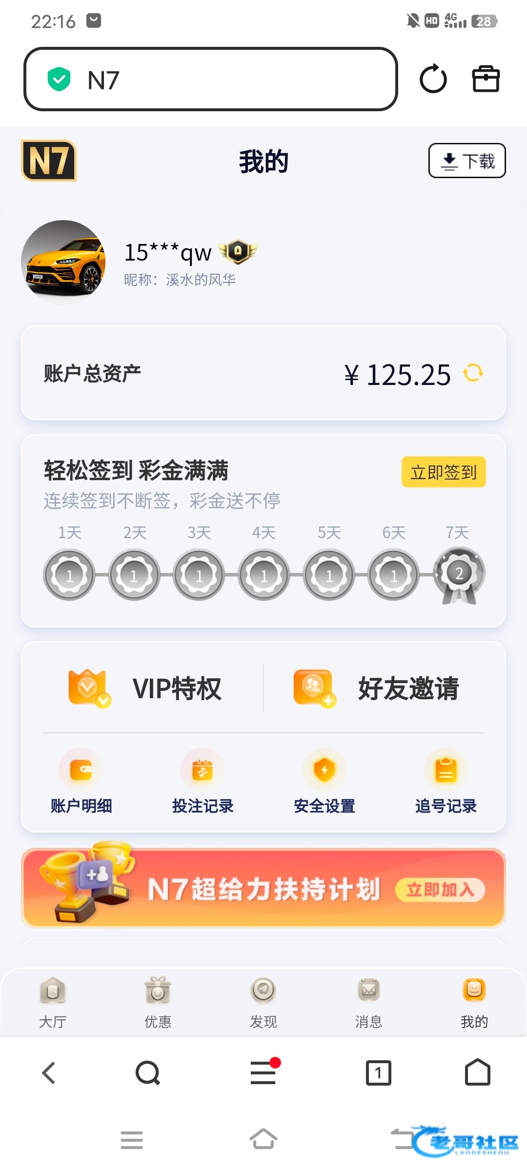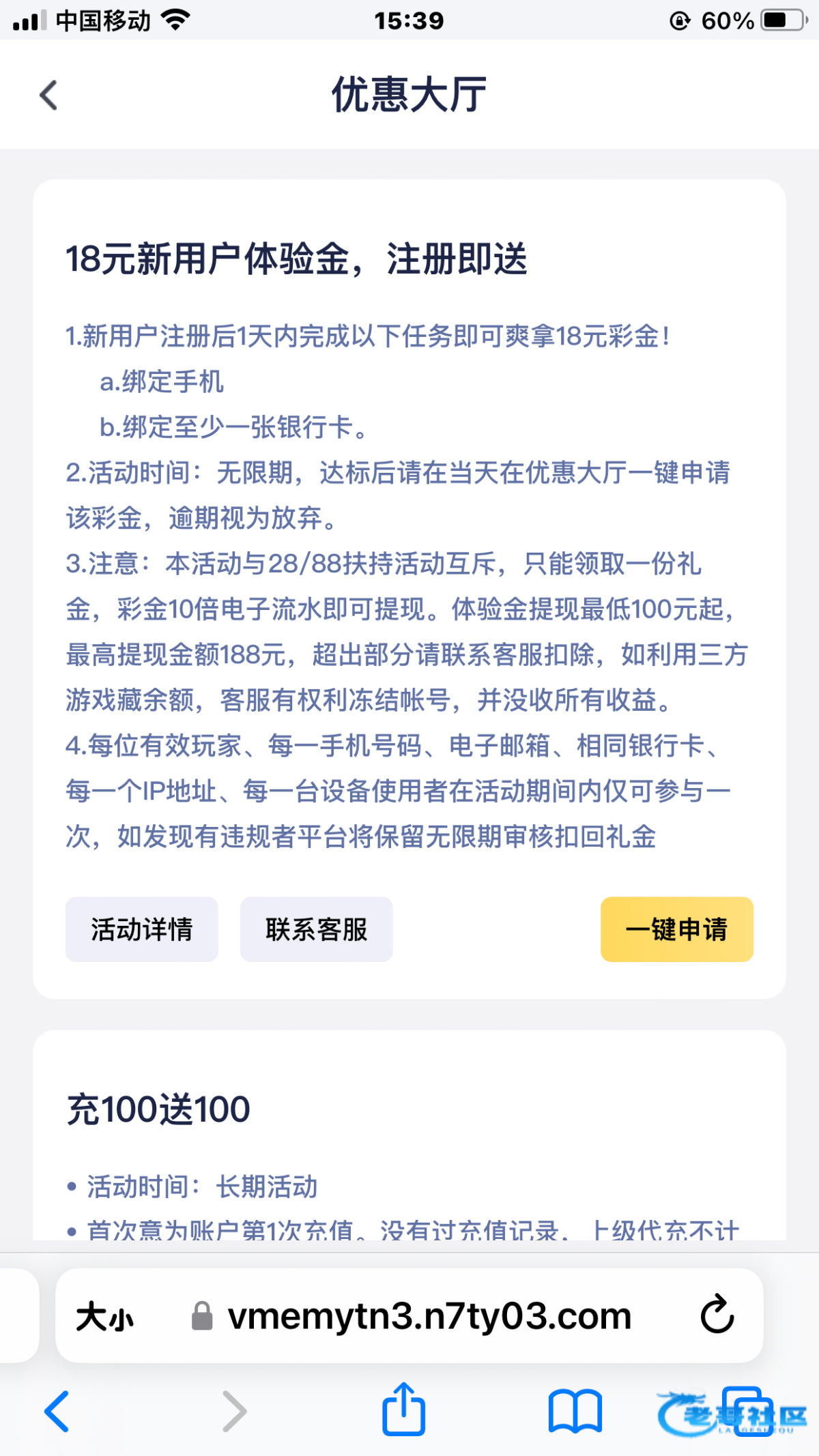 n7ty.com 注册完善手机绑定一个收款就可以申请到,优惠活动中自助申请新用户彩金,限制电子10倍水,最高提188,出款自测