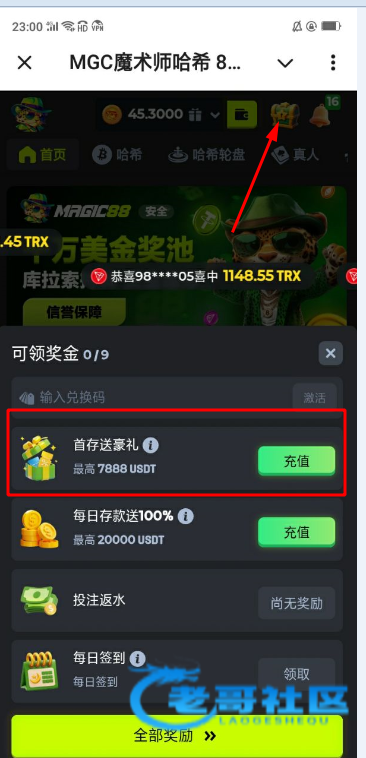 先点宝箱,20达到5倍流水后会有一个激活活动,我因为领过了,所以消失了,应该是在首存送豪礼上面的,激活之后会有5U到USDT钱包,跟着图操作就可以了