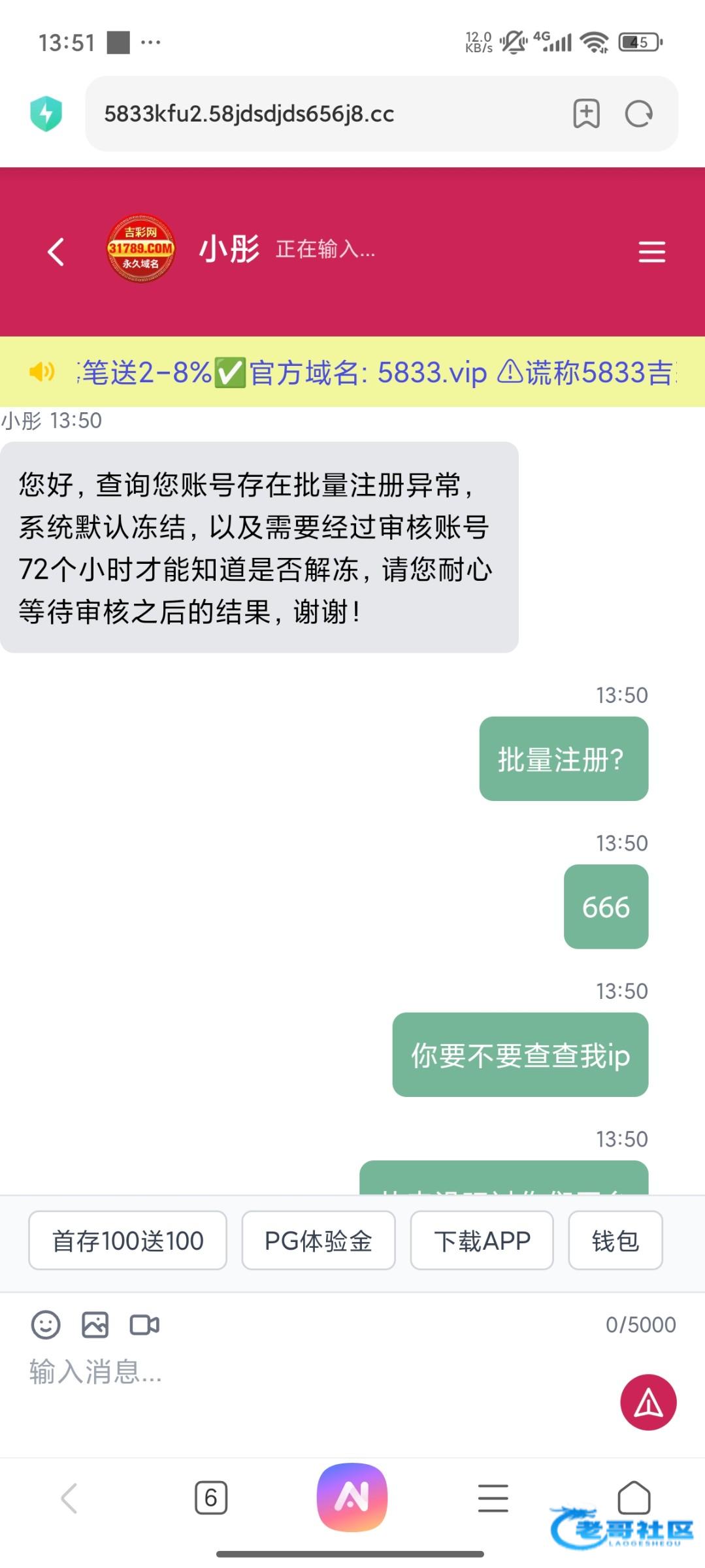 中午看见有老哥发充值100送一百,注册刚充值好就封号666