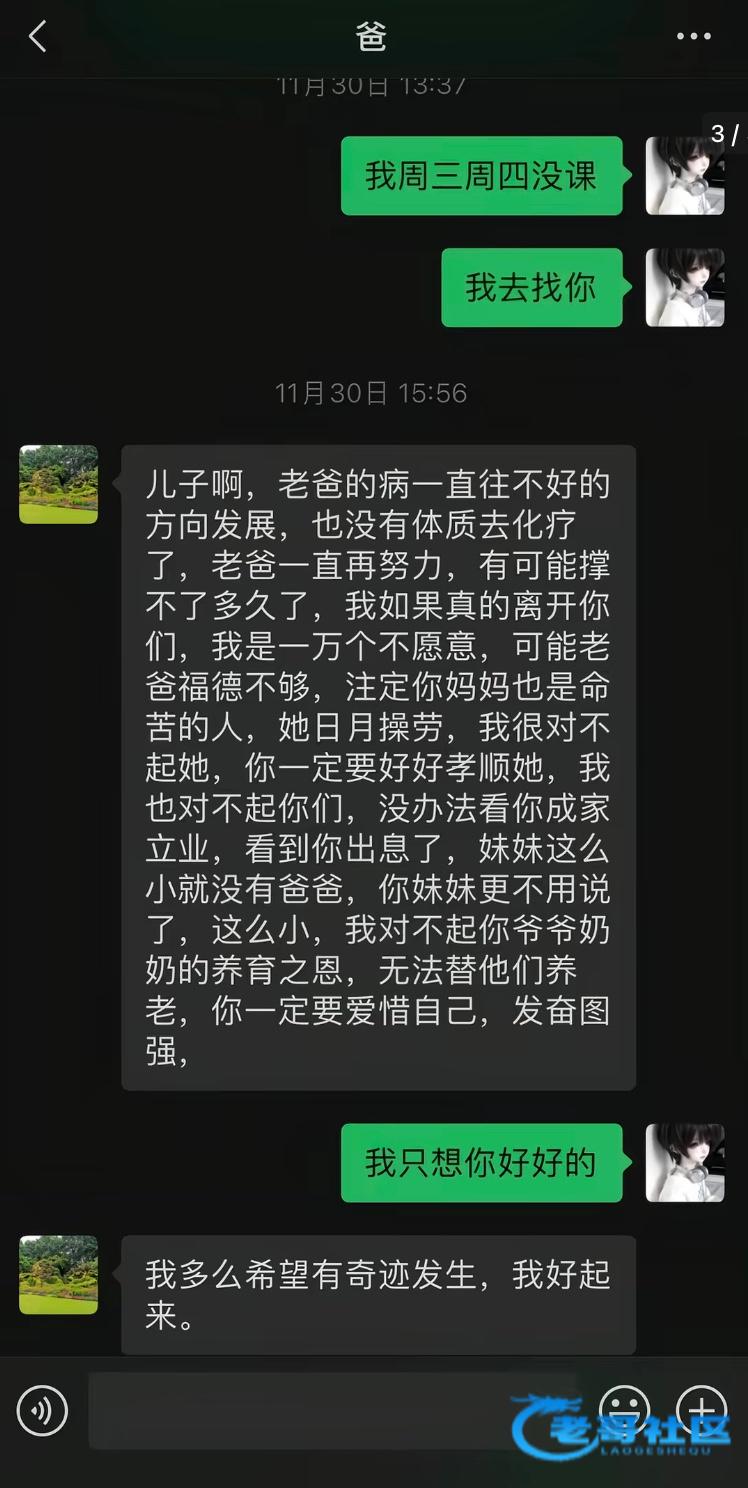 你的手好冰,我捂不热,我好想你。你不在我心里面少了一块肉,我回家以后再也看不到你了,我从16年初三开始,就不让您省心。我抽烟,谈恋爱,不去上课,厌学,赌博,干了很多坏事,让您费了太多心思。是你一步步把我拉回来,我扪心自问很多次,如果换成我,看见我的儿子这么不省心,我一定不会再多管。你依旧一次次把我拉回来,我甚至吃药,自杀,抑郁症,您都没有放弃过我。在我高一重度抑郁的时候,您同意了我回家,跟在你身边。我没有想过,当时我以为是最黑暗的日子,再后来却是我最幸福的一段时间。你在,家就在。没有你一次次拉我回来,我也上不了本科。从小,我就一直调皮,你什么都依着我,给我买最新款的遥控飞机,我两天就玩坏了,可贵了。当时你也心疼吧,却没有骂我,也没有打我。每次过年,最期待的就是你给我发的红包,还有你每次买的无人机,其实我都很喜欢。你都45岁了,还会陪我放炮,虽然你明知道,我已经长大了,是不是不这样做,我们就没有共同话题。有时候你看见我一回家就上楼,你也想和我说说话,但是不知道如何开口,对吧。中式父子关系困扰了很多人,其中也包括我们。一直没法对你敞开心扉。其实我一直觉得,我老爸是世界上最厉害的老爸,他创业失败,负债,家庭离异,儿子叛逆,都没有击倒他。一次次坚强,一次次重新站起来。直到这两年,开始慢慢变好。今年年初,忽然传来噩耗,明明过年的时候还在开心打麻将的你,怎么在一个月后就躺到病床上了呢,怎么会忽然就胃癌晚期了呢。我多想你再起来,和我说,儿子你让我好头疼,虽然你骂我,但我长大之后你就再也没有多说过什么,也没像小时候那样动手打我。我一直很讨厌你的脾气,直到后来我才发现,原来我的脾气最像你。一次次的包容我,不管什么借口,找你要钱,你都会给我。哪怕在你最困难的时候,你宁愿一双几十块钱的鞋子穿一年,都转钱让我买一两千的鞋子,只为了满足我的虚荣心。生病很严重的情况下,还记得我的生日,拿水都稳不住的手,一字字拼成了生日快乐。我对不起你,这辈子让你受了太多苦,我愿意下辈子,每一辈子,都做您的儿子。小时候我老说感觉你不爱我,可是长大了,才发现,你的爱是说不出口,你的爱是默默支持。如果这辈子,教我养我太苦,那您下辈子来当我儿子,我为您操心,我一定好好待你。老爸,你不在,我心里空空的。我再也没有老爸了。回家以后再也不会有人半夜给我煮夜宵问我饿不饿了。也不会再有人一次次替我擦屁股,你真的好伟大,全世界最好的父亲。亲人的离去,是我一辈子也无法治愈的伤。愿您来世幸福不再受苦。晚安,老爸,我爱你。