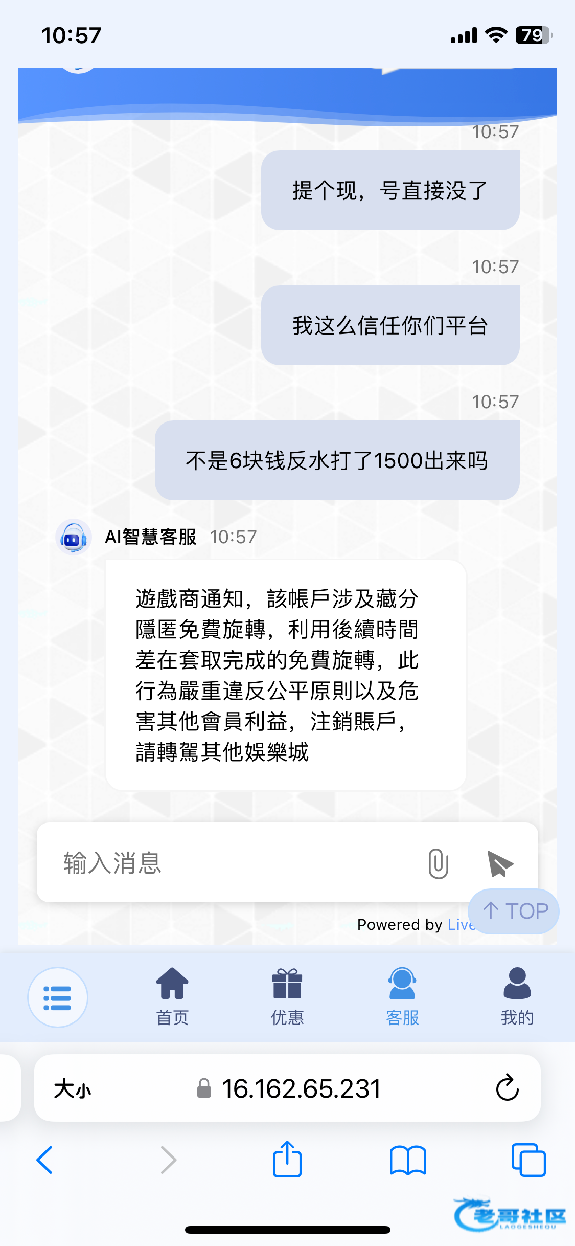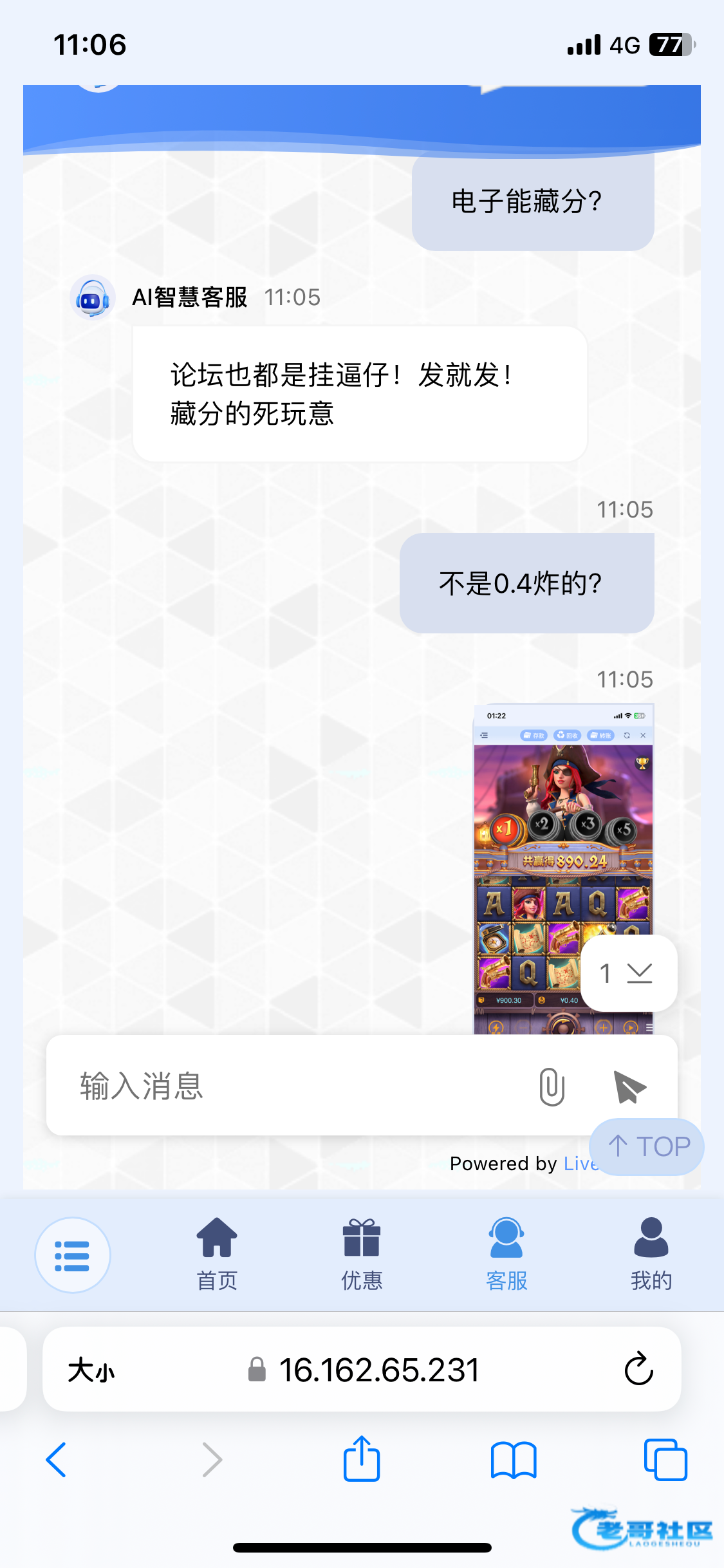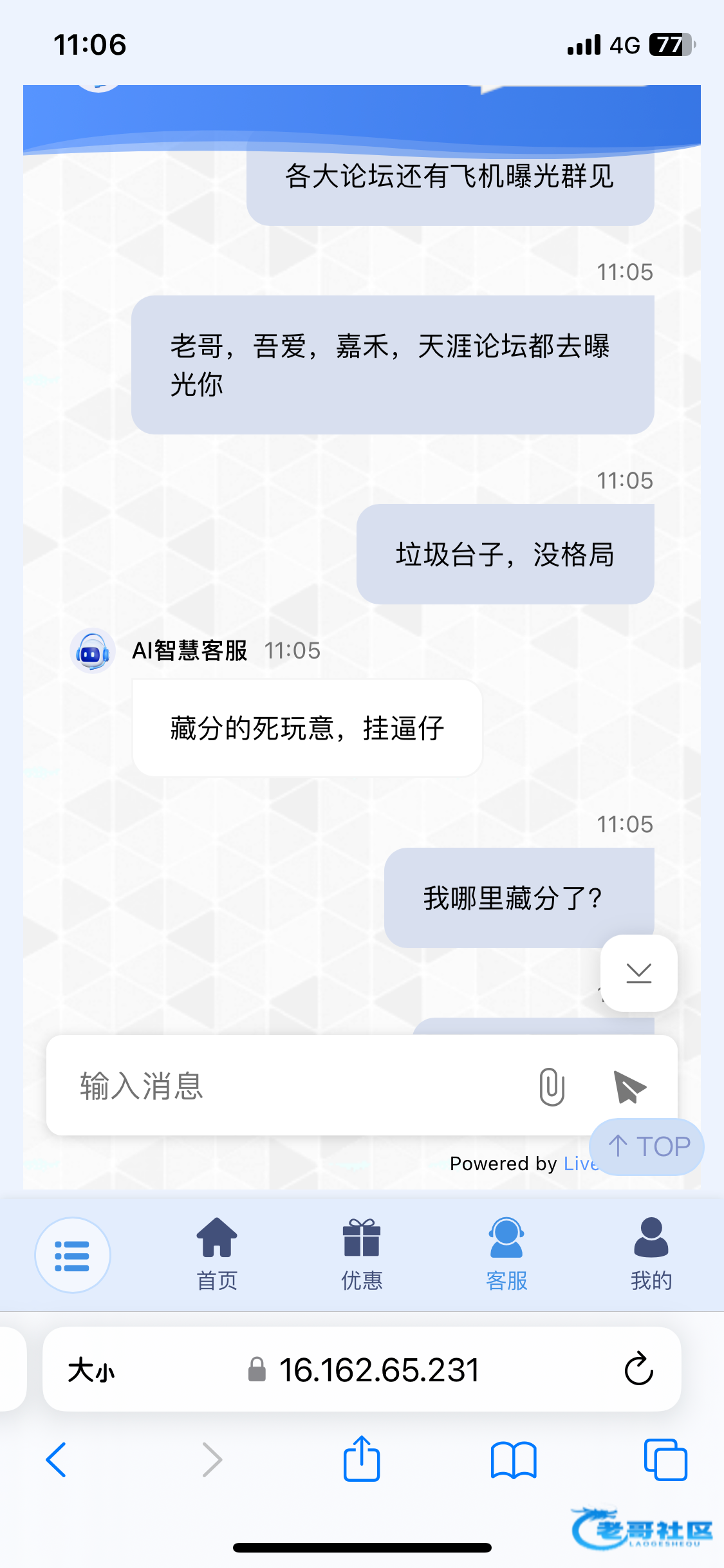 然后这个客服说随便说。说我们论坛的都是挂逼仔,羊毛党
