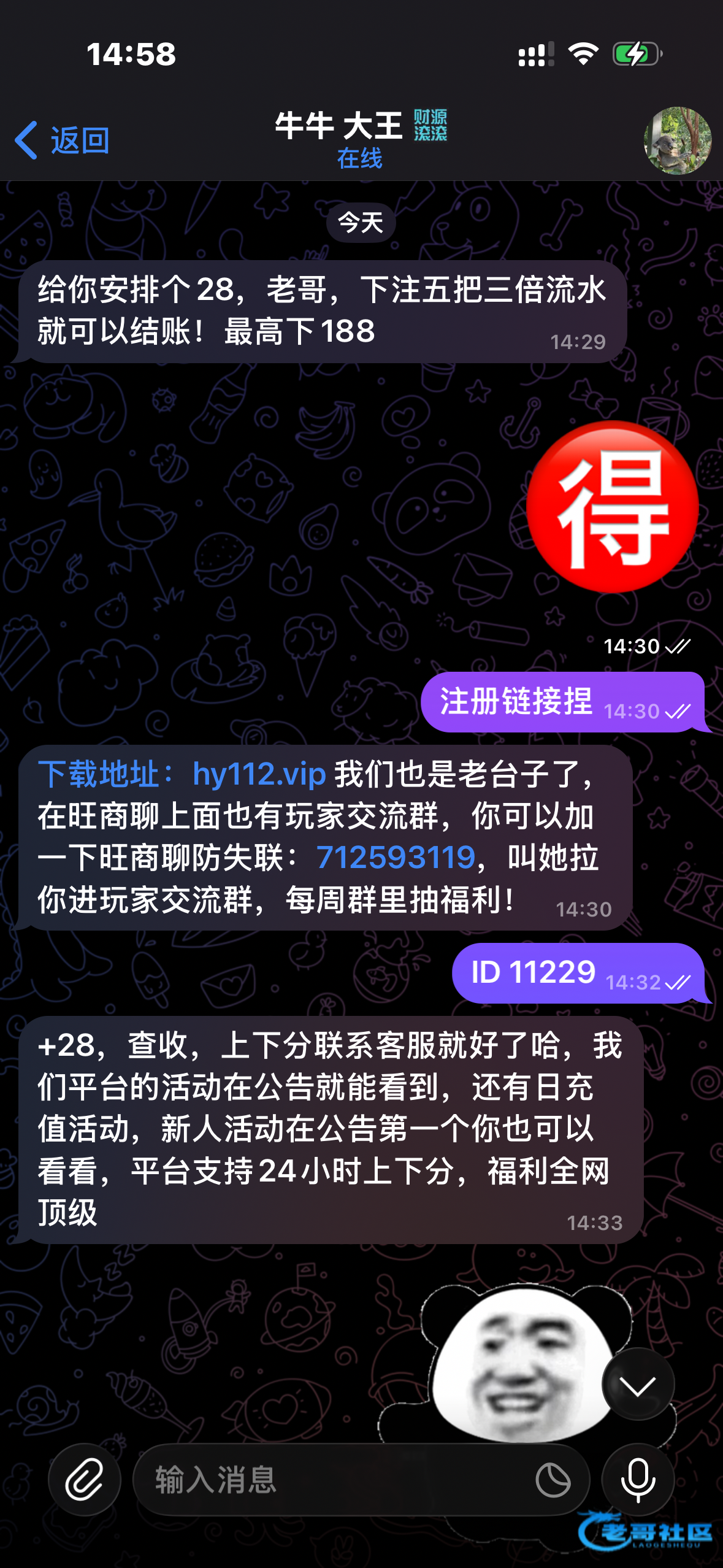 先准备最近下下注28的记录然后加他他会查你最近有没有玩不用加那个旺旺找他飞机申请我没打出来骂我的都没爹妈@a789332