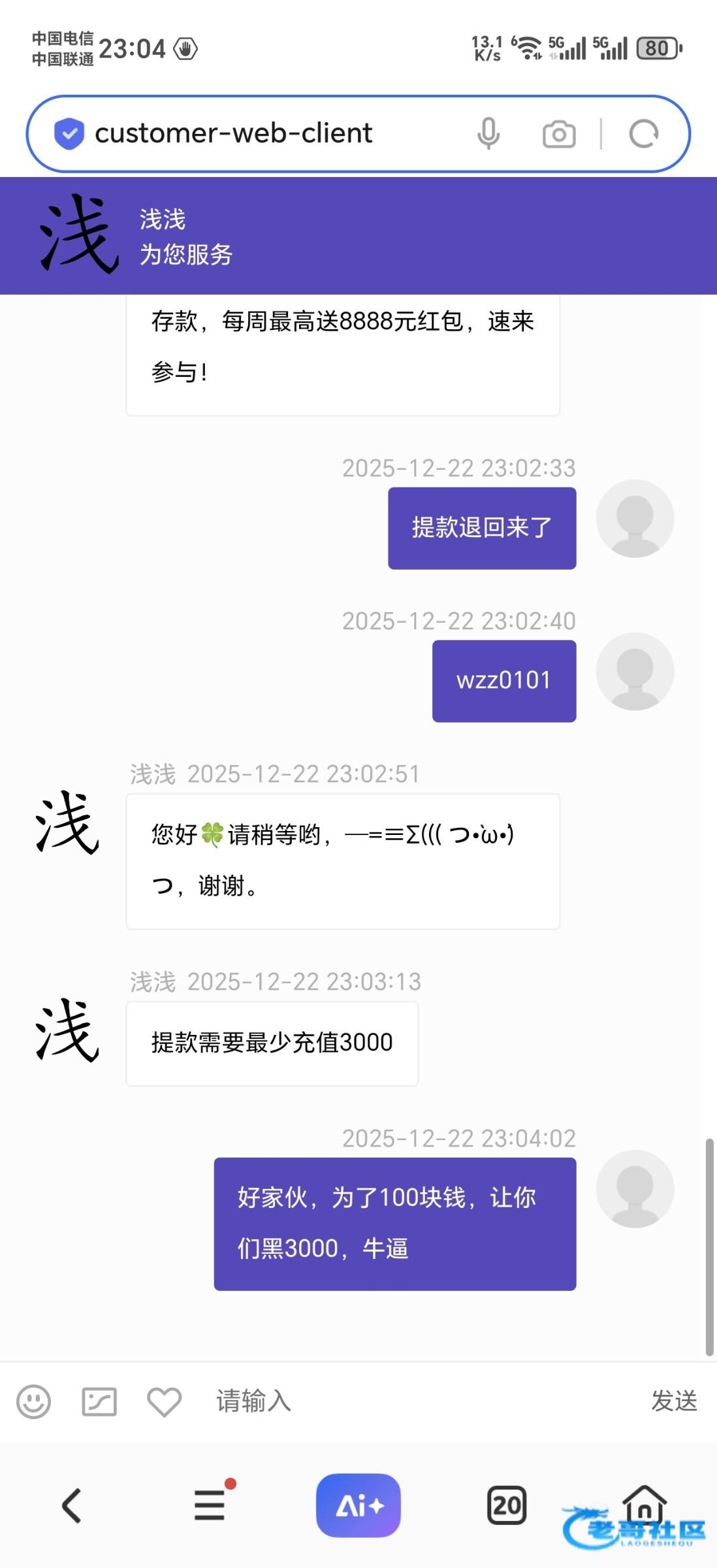 这台子牛逼,电话特邀送58玩体育到138,提100,要求冲3000,哈哈,笑死我了