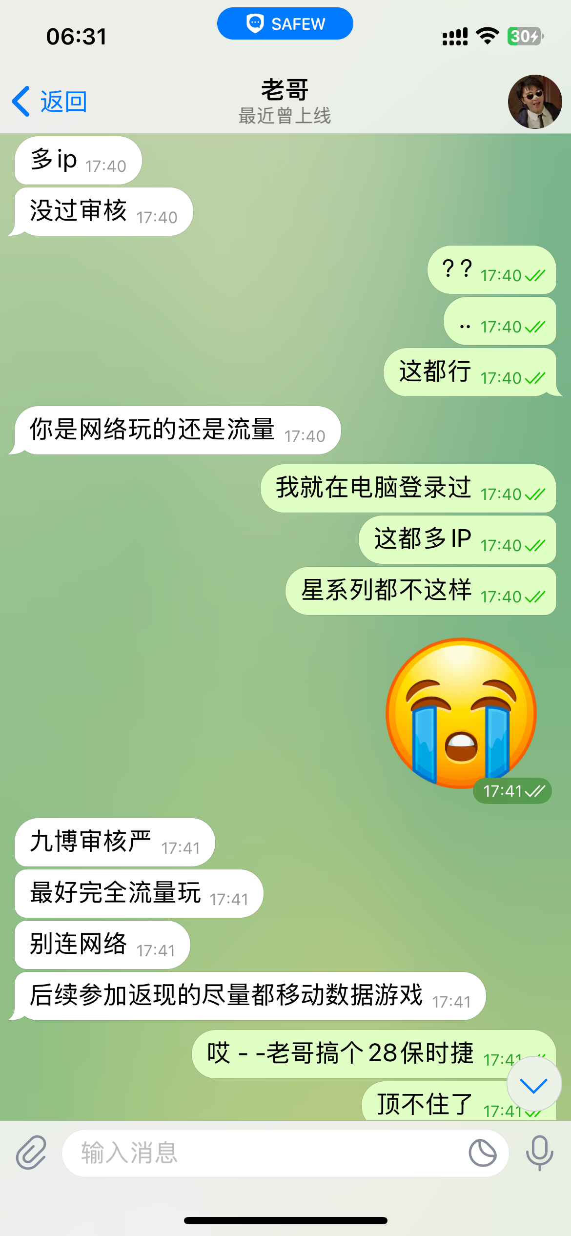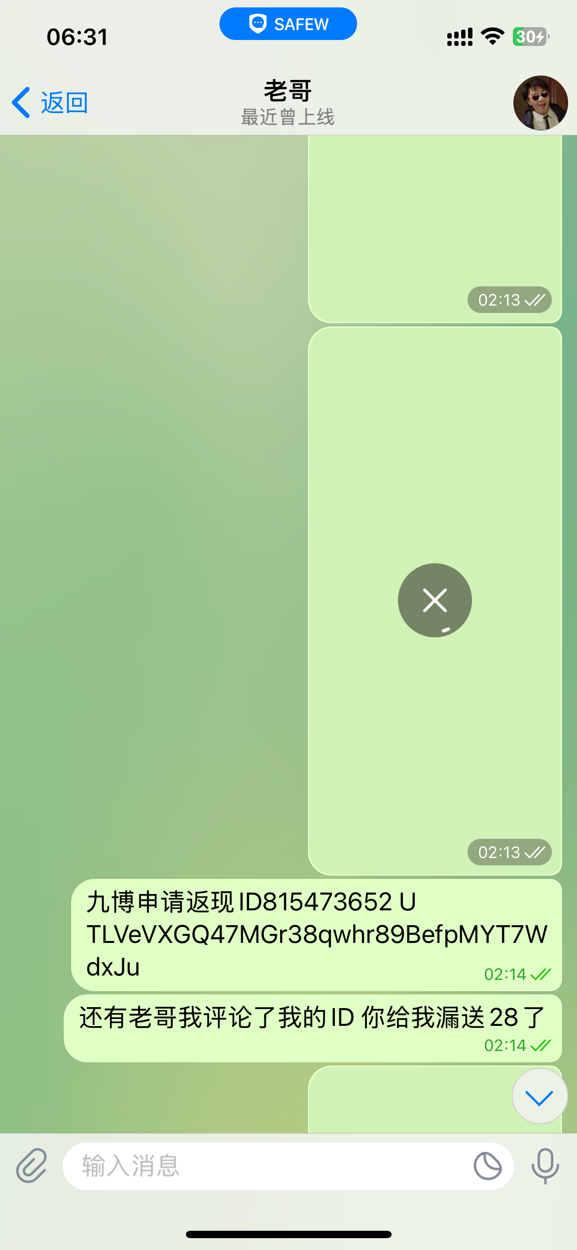 也是晚上闲的无聊,在隔壁论坛看到什么safew说不能用手机号注册容易被请喝茶,然后我就注销了那个号,用邮箱登陆上去看到和老哥的聊天记录,是我找老哥返现九博的事情,一看账号再和论坛一对比他妈的才发现被骗了,还好那几把骗子想钓鱼给我发了个88!我那时候感觉都不对劲,因为这个假老哥给我推那个神灯体育说1000返现888,大家一定注意老哥的safew号是ddee0!别被骗了!