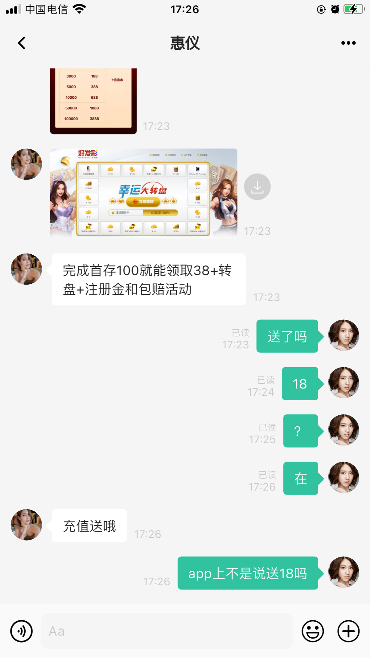 前几天 打短信送了38 打到150提了