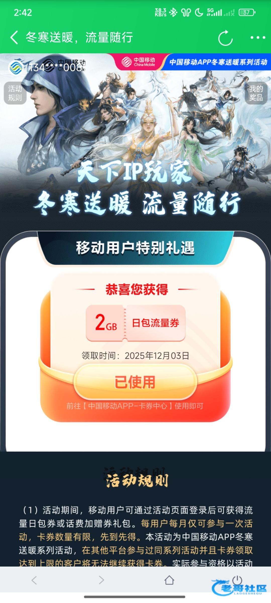 缺流量的可以领下券有效期7天,在“中国移动APP-我的卡券”中激活