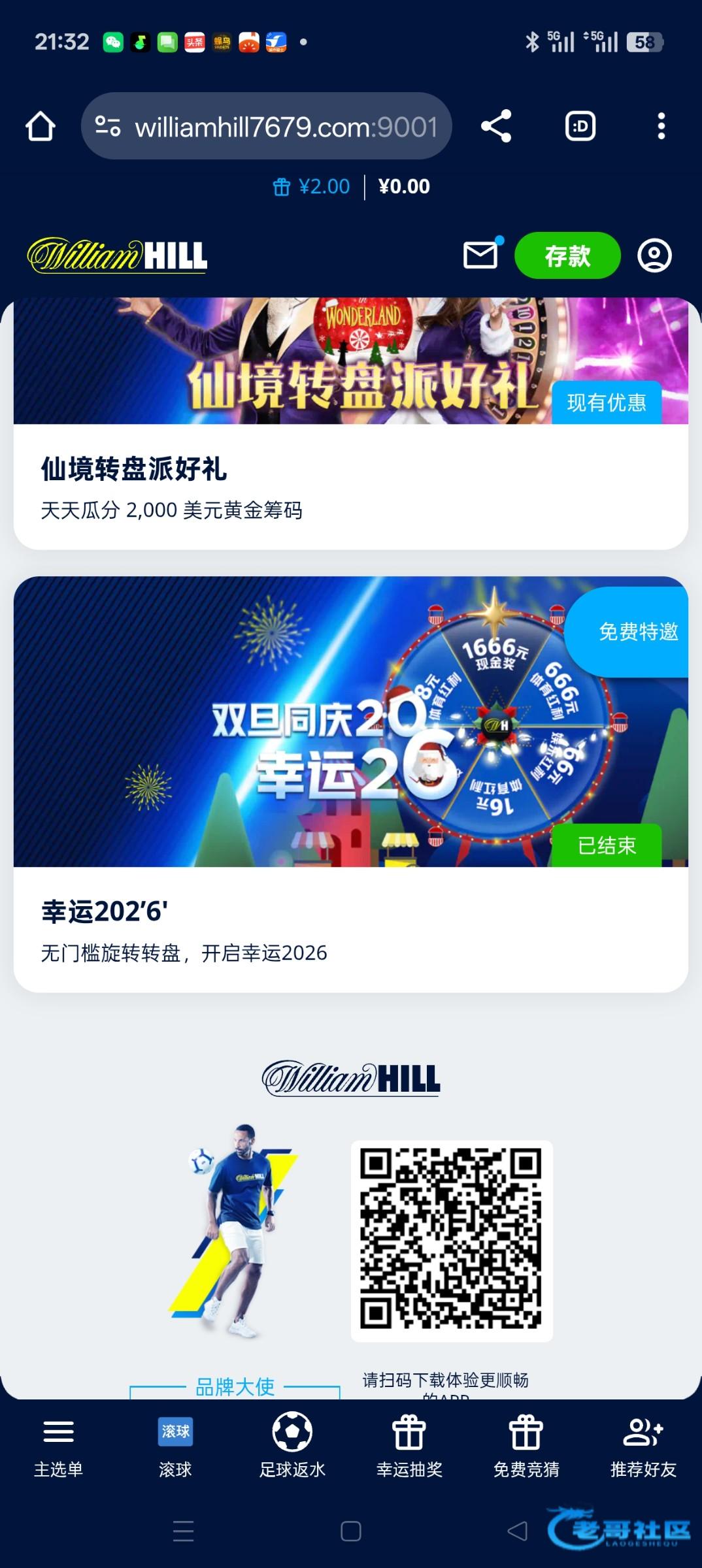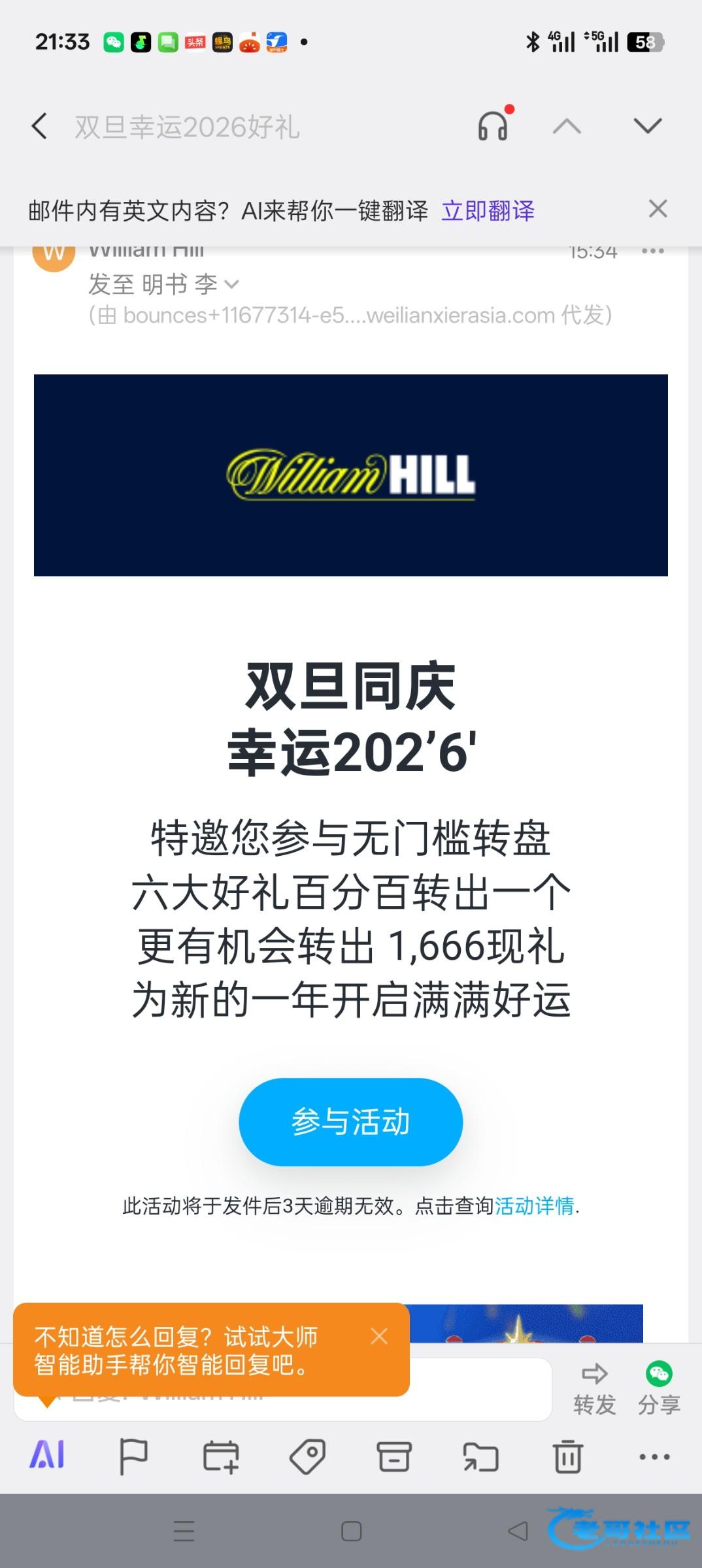 我是收到邮箱的,上线里面有个幸运2026活动点进去旋转就能抽奖,我抽到了66有号的可以去看看https://www.williamhill7679.com:9001/zh-cn/login