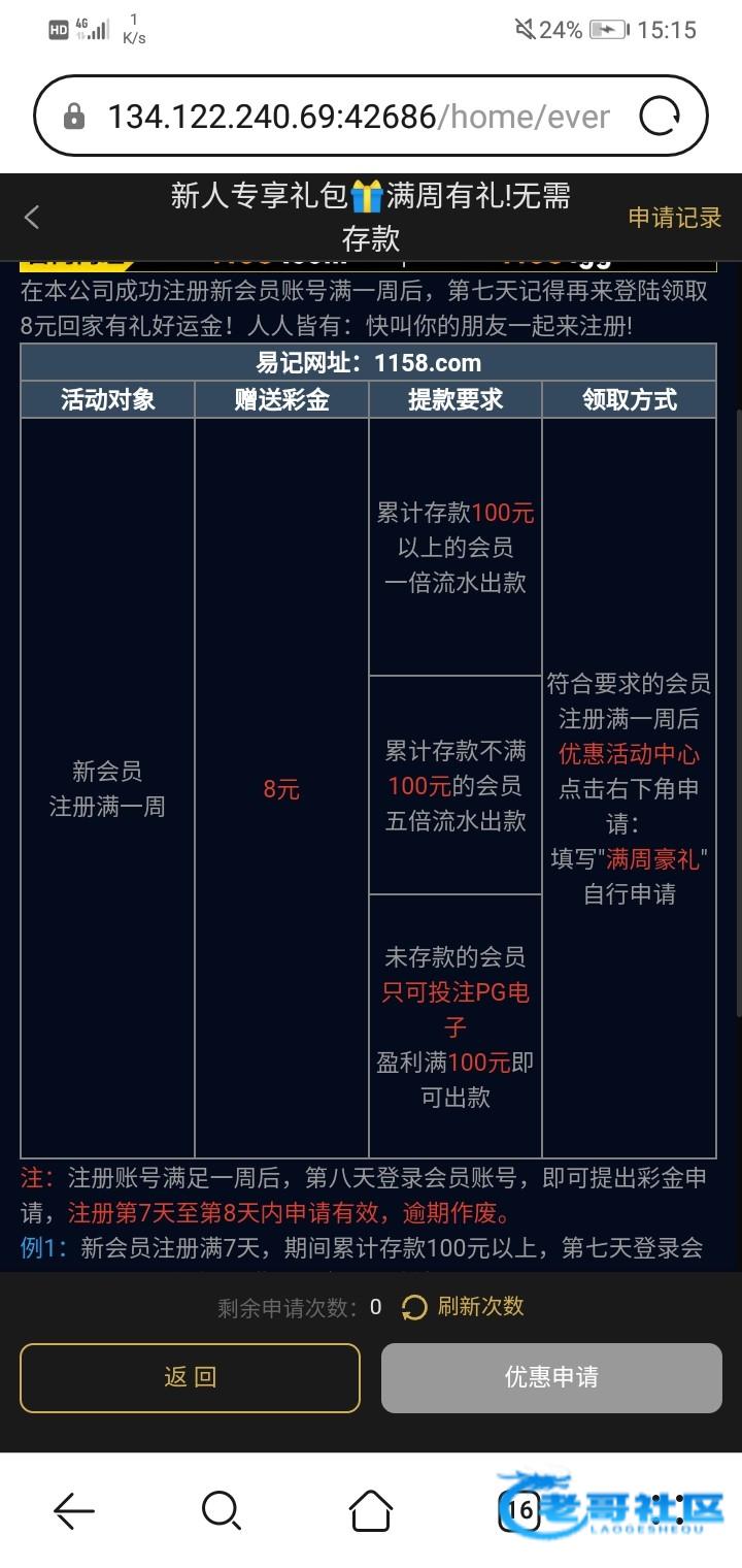 上个帖子注册过的,今天刚好8天,点击新人最下面自助申请,不要存款,网站:1158.com