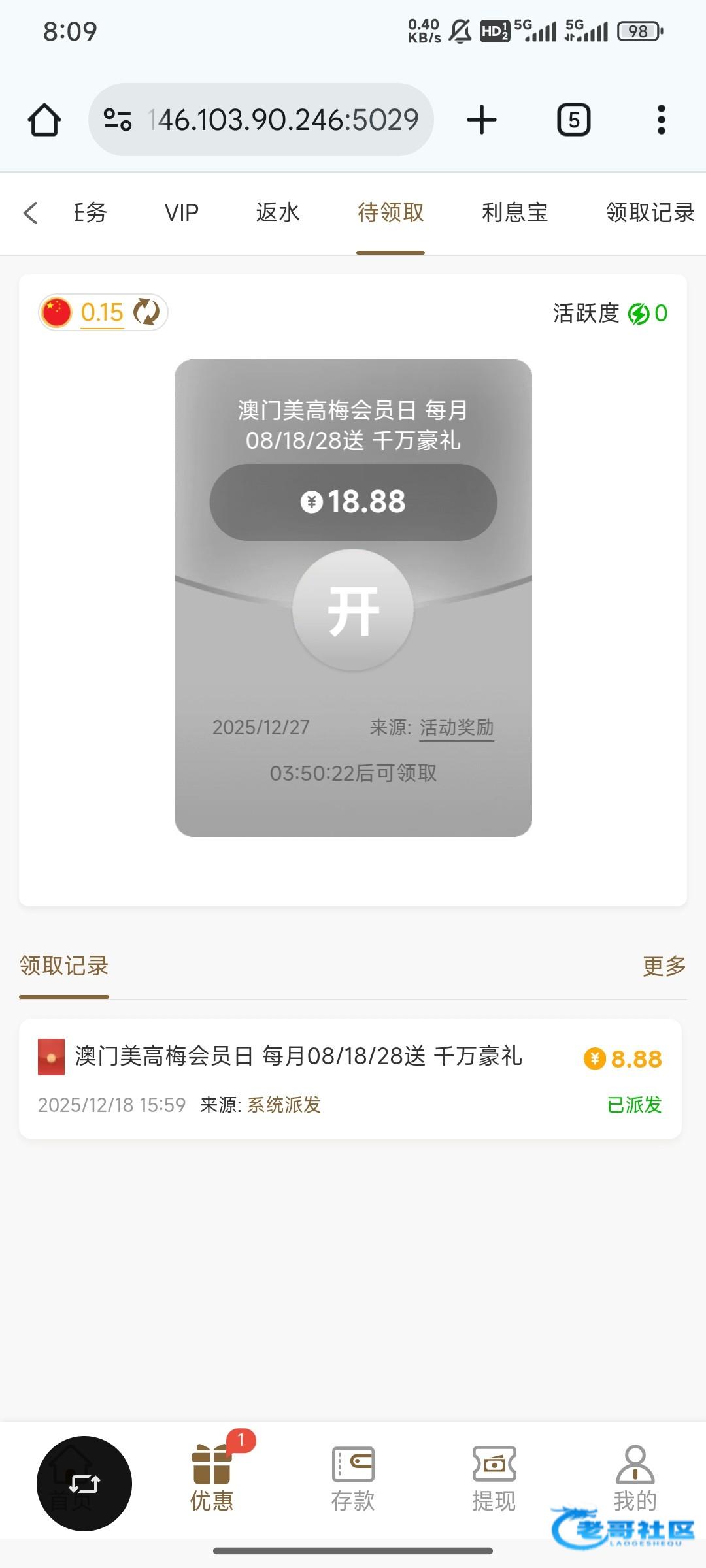 188.top 每个月8号 18 28 领取彩金 应该是充值10就可以领取了 今天中午12点