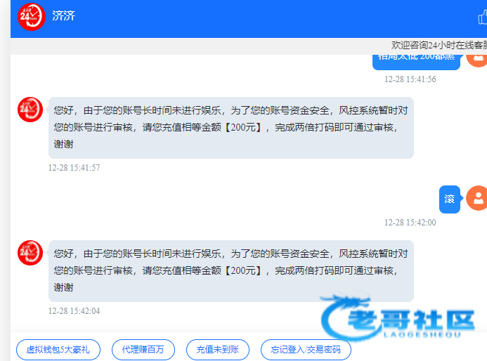 几年的老账号 这几天活动 红包出200让我充值200打流水才能提 提款前2天都有充值记录,结果24小时没充值账号都冻结 这平台开始黑了,这种就是无限充值套路 上1个就是008这种老台子 也是老用户几年账号说黑就黑,这些台格局越来越小了