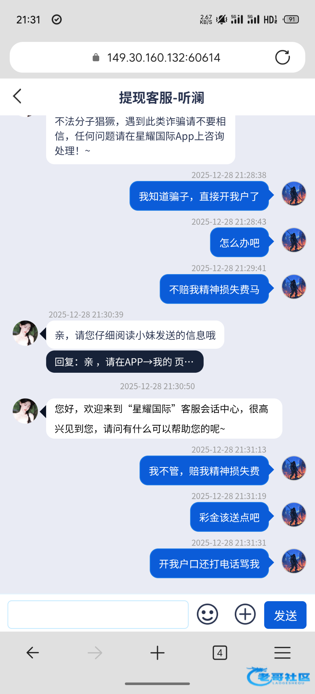 星耀提2000支付宝,然后进了1000,接着被骗子把收款码搞风控,然后打电话跟我说转我微信,接着套路我转钱给它这条哈巴狗,我当然不会转,见我不转钱过去就骂我,还说开我户,找星耀客服赔偿精神损失费不赔。