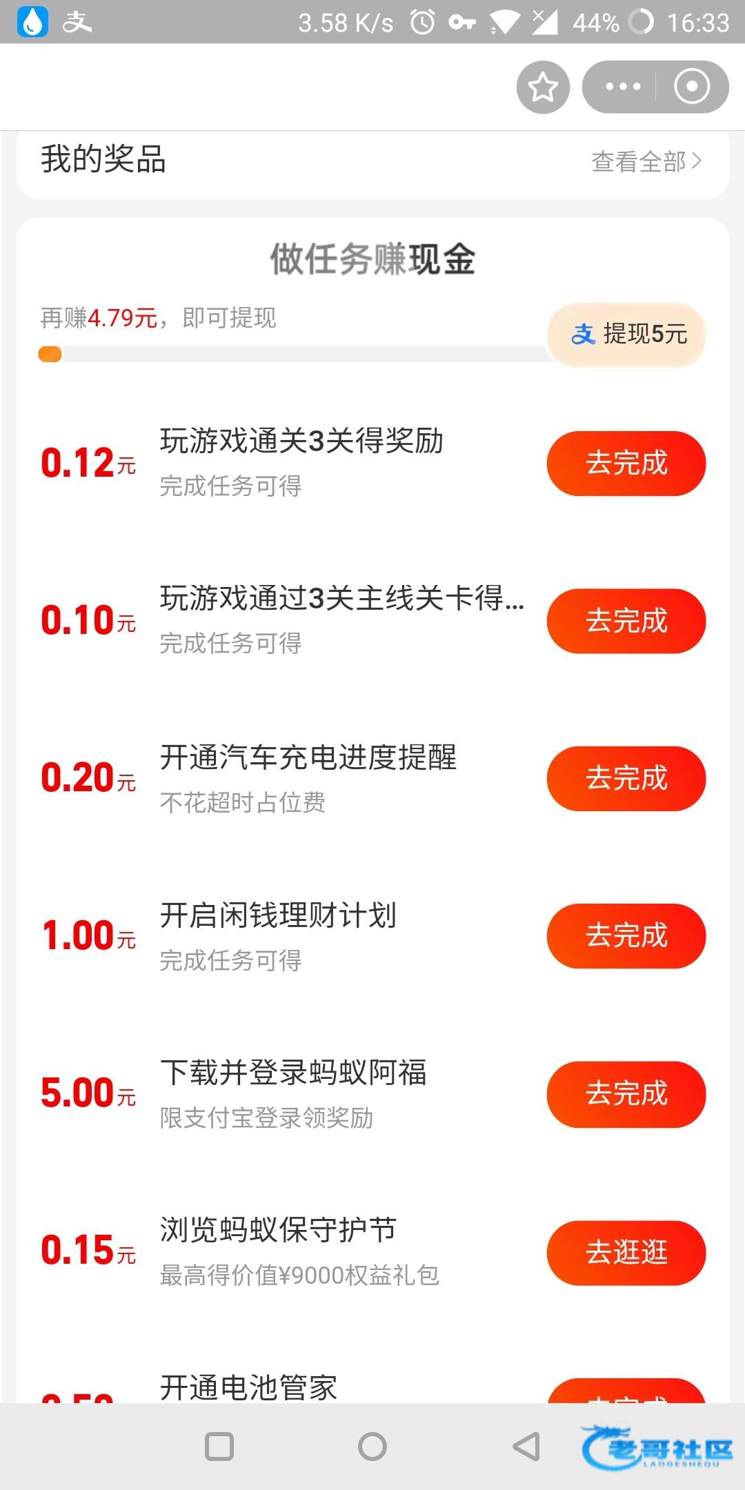 首页搜“玩赚支付宝”,下方有个任务“下载登录蚂蚁阿福”。完成后可得5元。