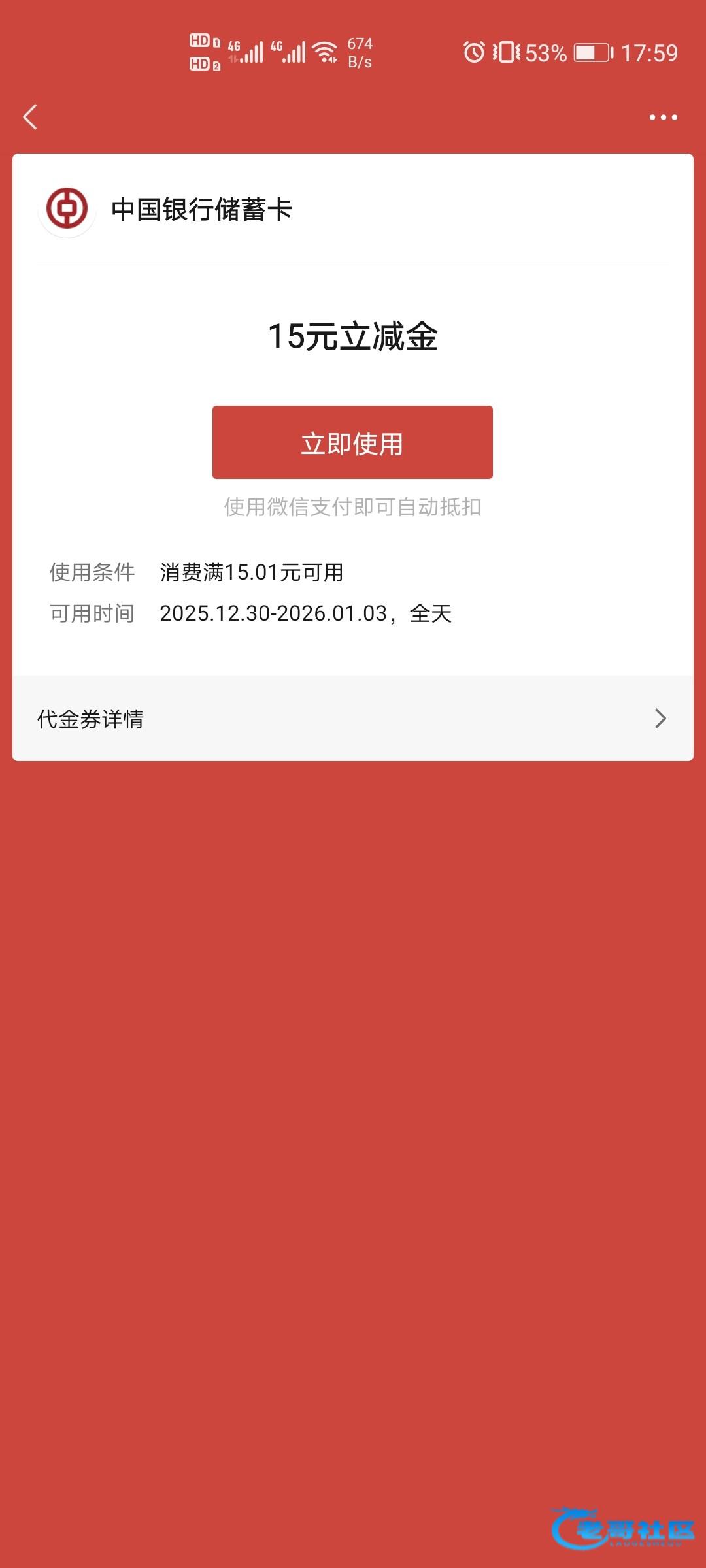 中国银行app搜索本地福利1块钱换微信立减金15到288立减金