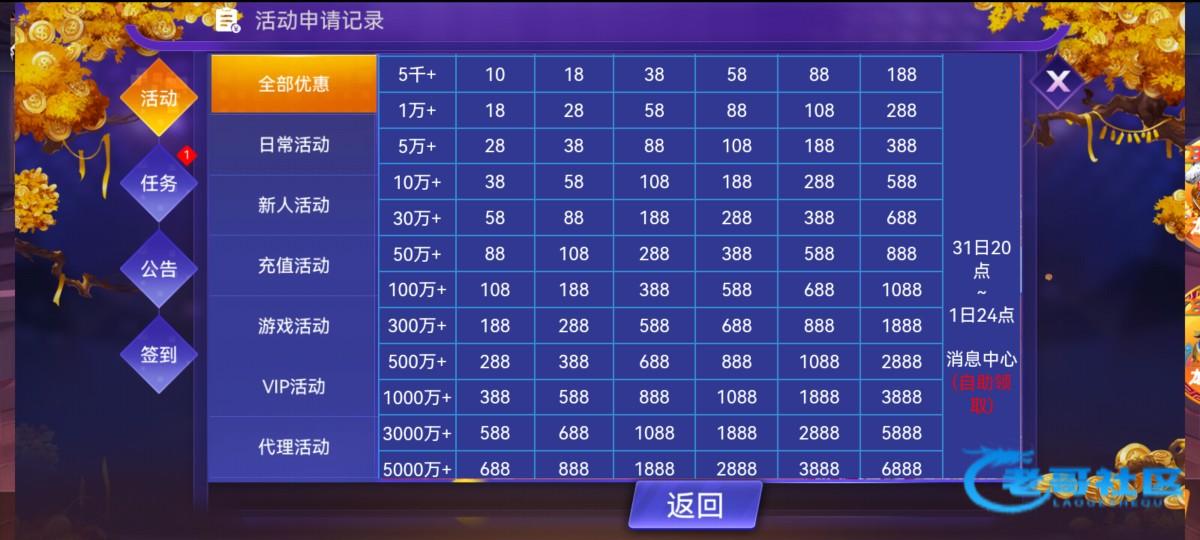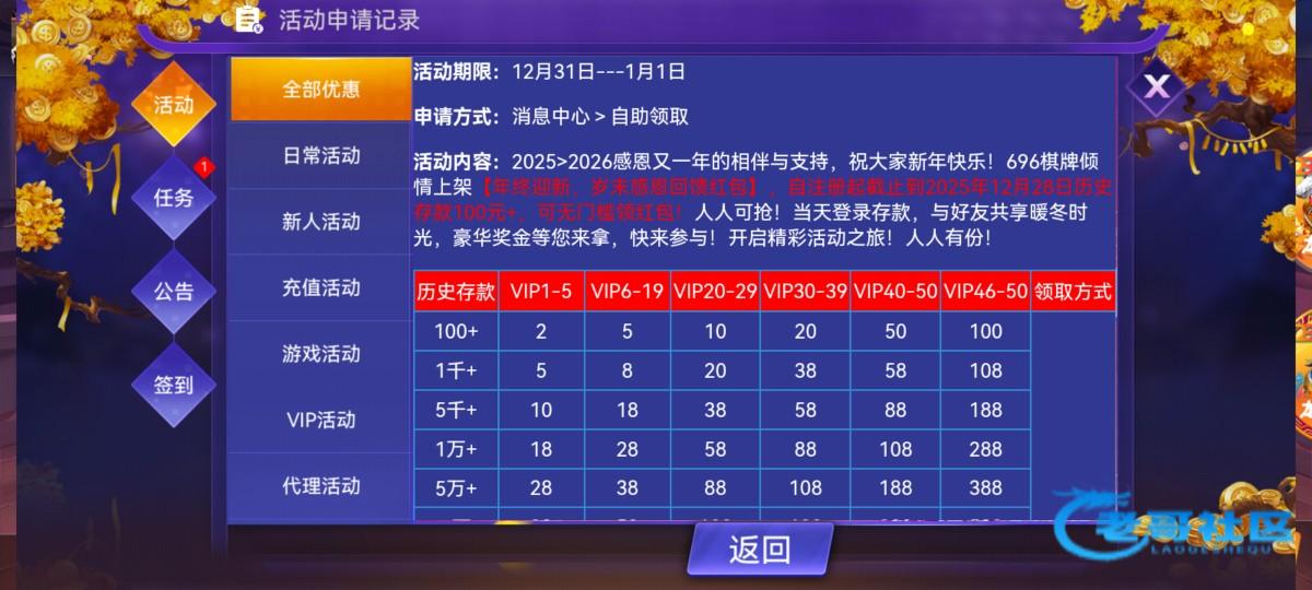 网址 696.tc 历史充值过的今天晚上8点可以领回馈,领多少看图,没充值过的不用去了,另外如果优惠封了去发邮箱反馈,我原来是捕鱼以小博大的时候给的彩金老打棋牌被封了优惠,后来自己发邮箱反馈申诉,发了邮箱之后让我充值打活跃度我就没吊他,结果隔了一段时间上去就自己解开了