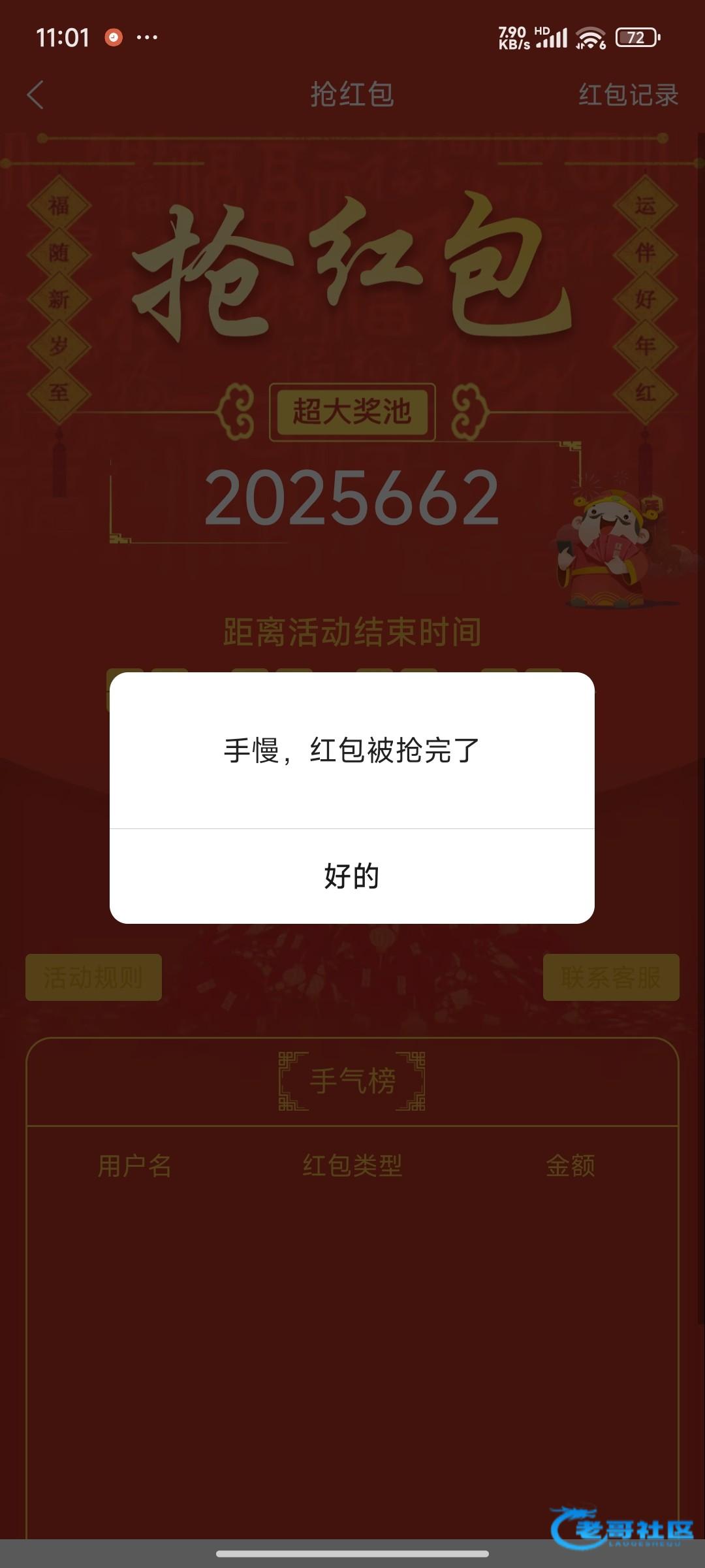 11点红包,我登陆进去很卡,进去了抢红包活动刚进行1分钟就没了,还2025662元呢,假的要死,摆明了不给抢。