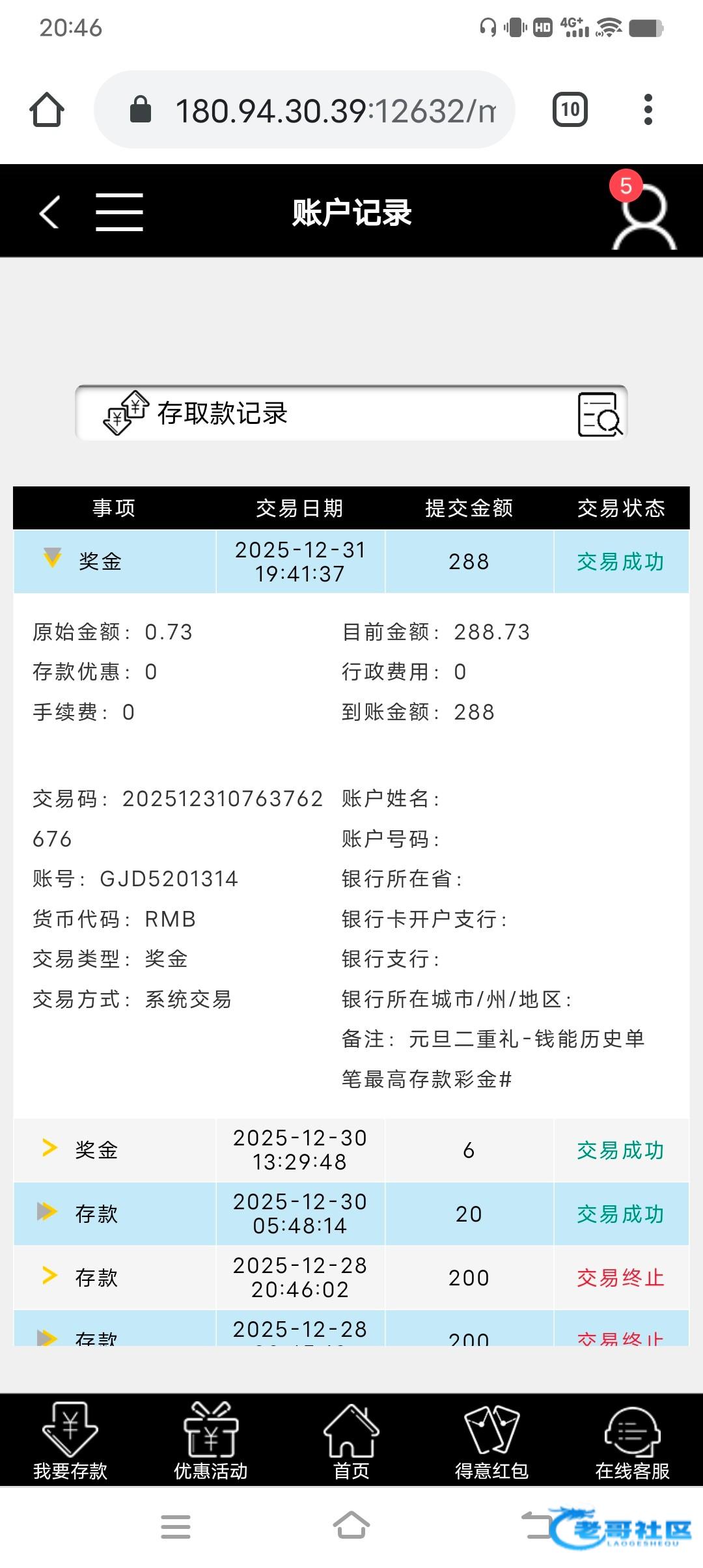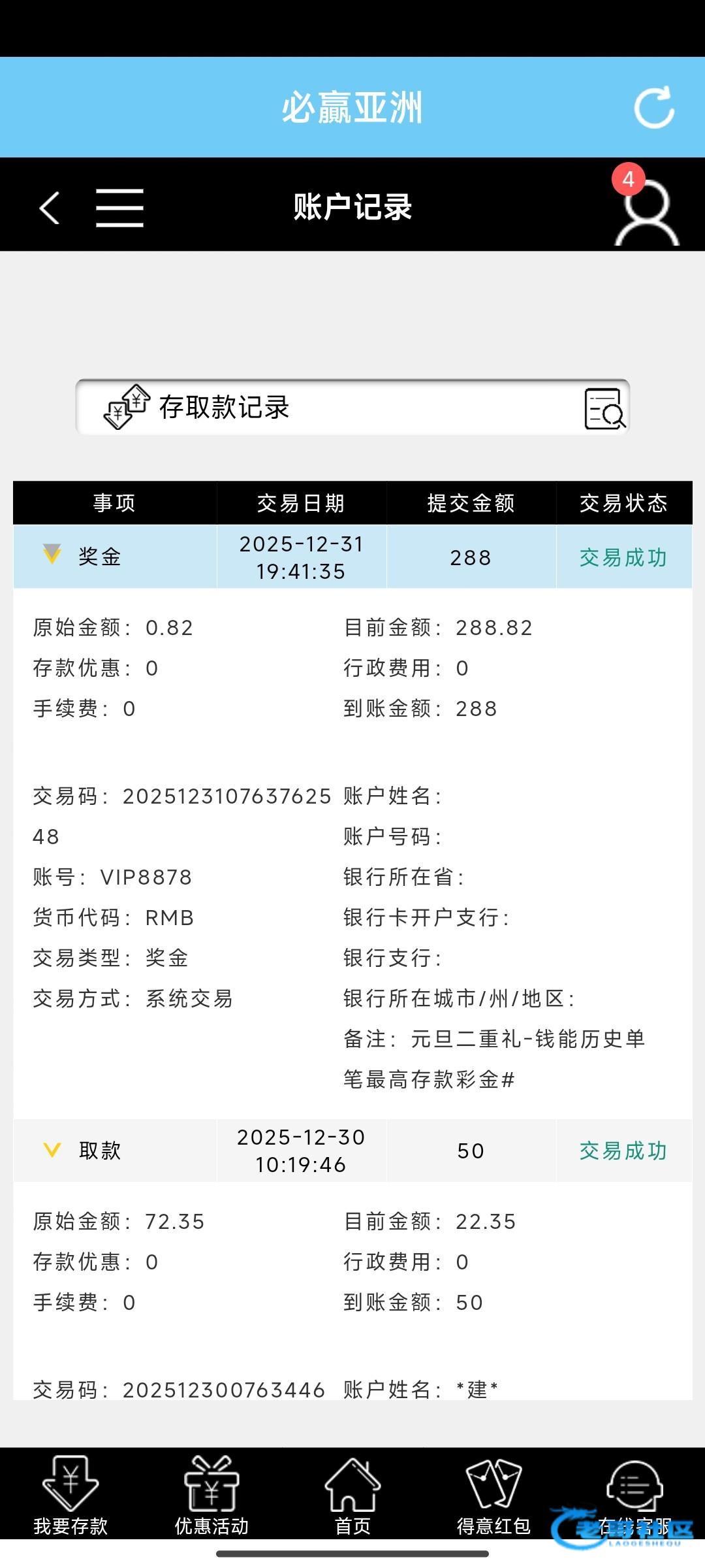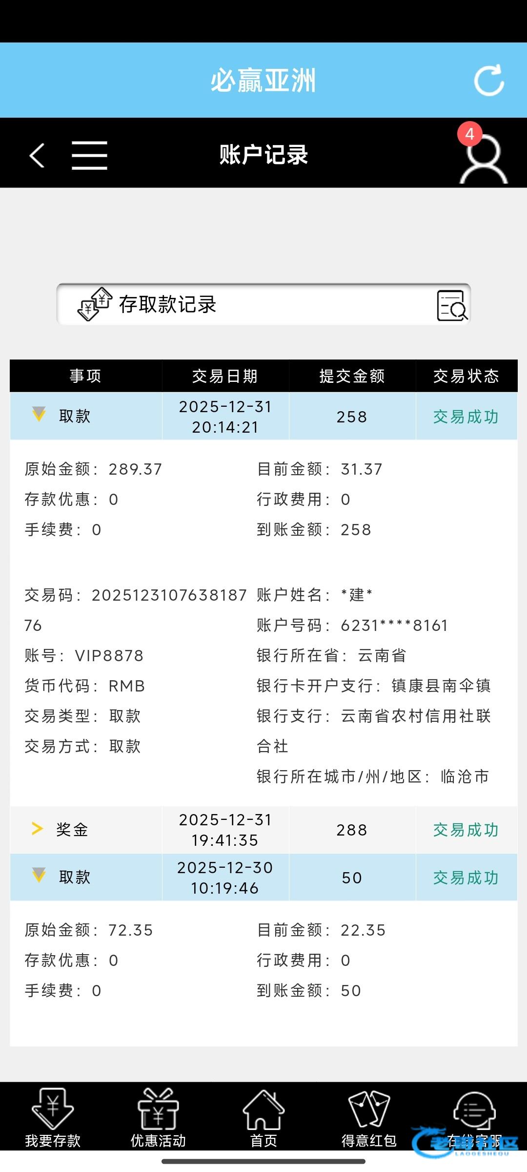 这个台子我差不多一年没玩了,看到今年有历史单笔。这几天就陆陆续续每天冲个30.50,活跃了一下账号,就怕提款时罚水,结果288提258到账了,剩下的30输回去了,不过今天在662赢回来了30,等于今天288到账了,对了,优惠里写着回馈只能钱能钱包提,我直接提卡里,也给到账了