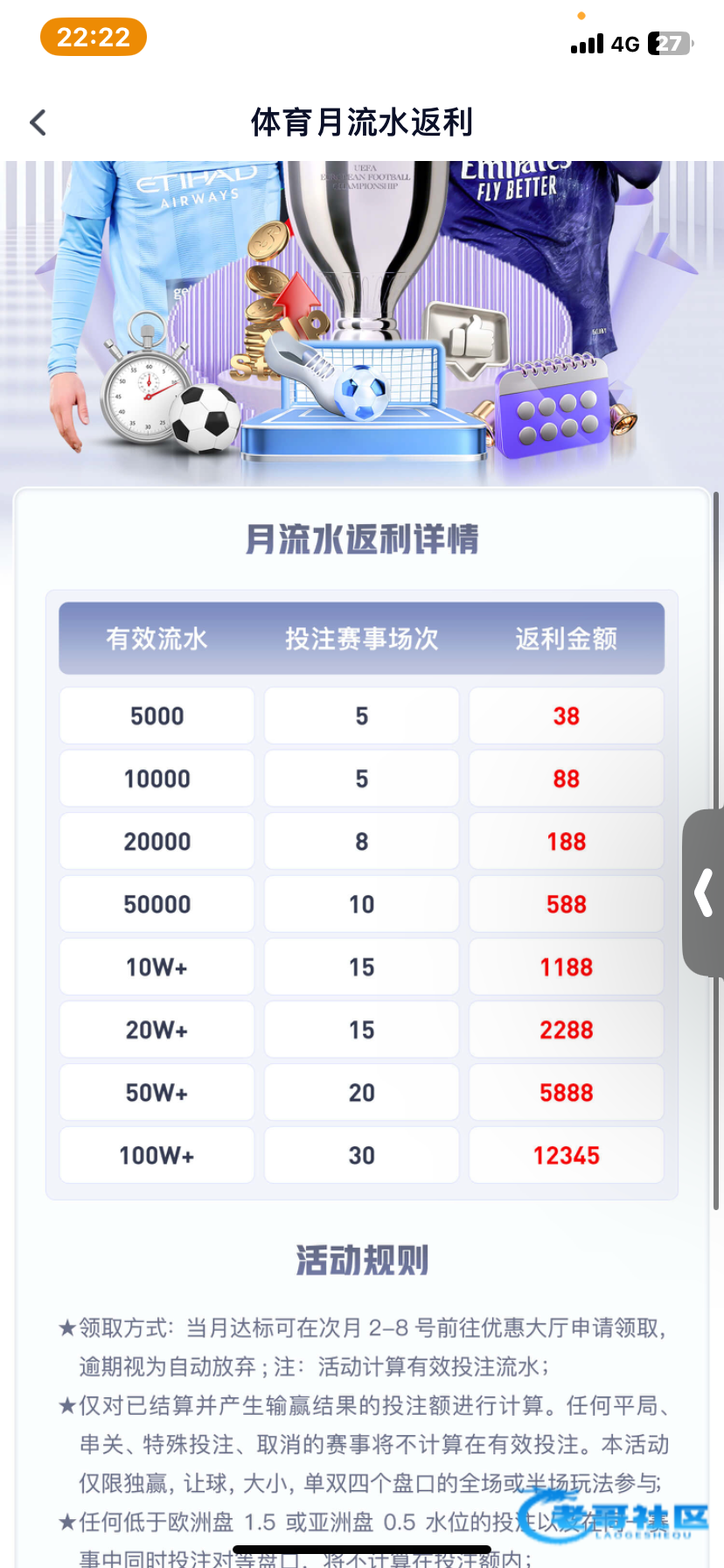 各位老哥能交流一下有没有福利高的体育台,每次月流水过10w只能吃这种低保,