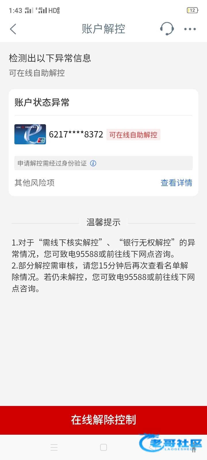 工商的话先试试在线自助解控,上次我也是我用的在线自助解控好了。资料我随便提交的就通过了