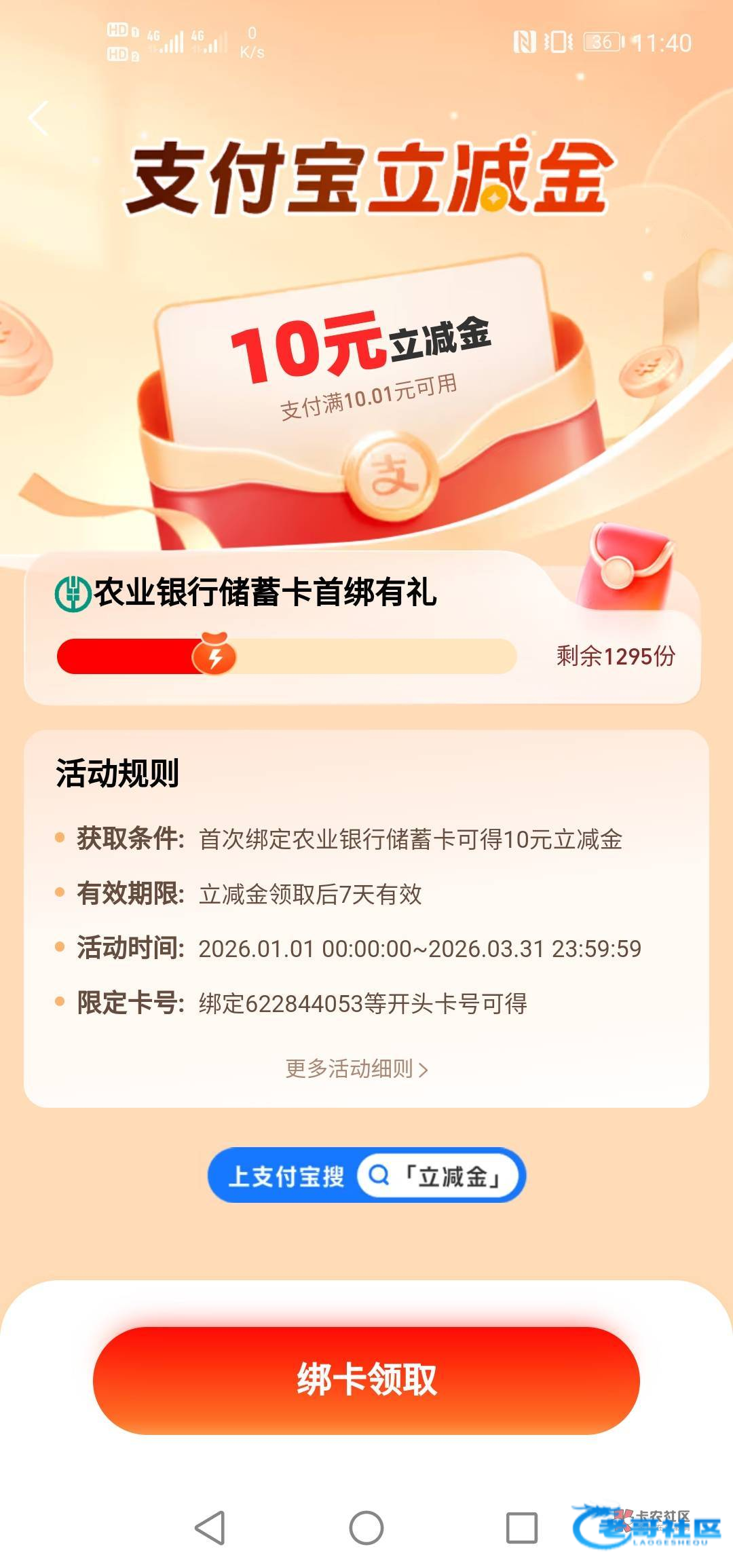 然后打开支付宝APP,搜索立减金、立减金选择农业银行。找到10元区首绑 623053053开头的